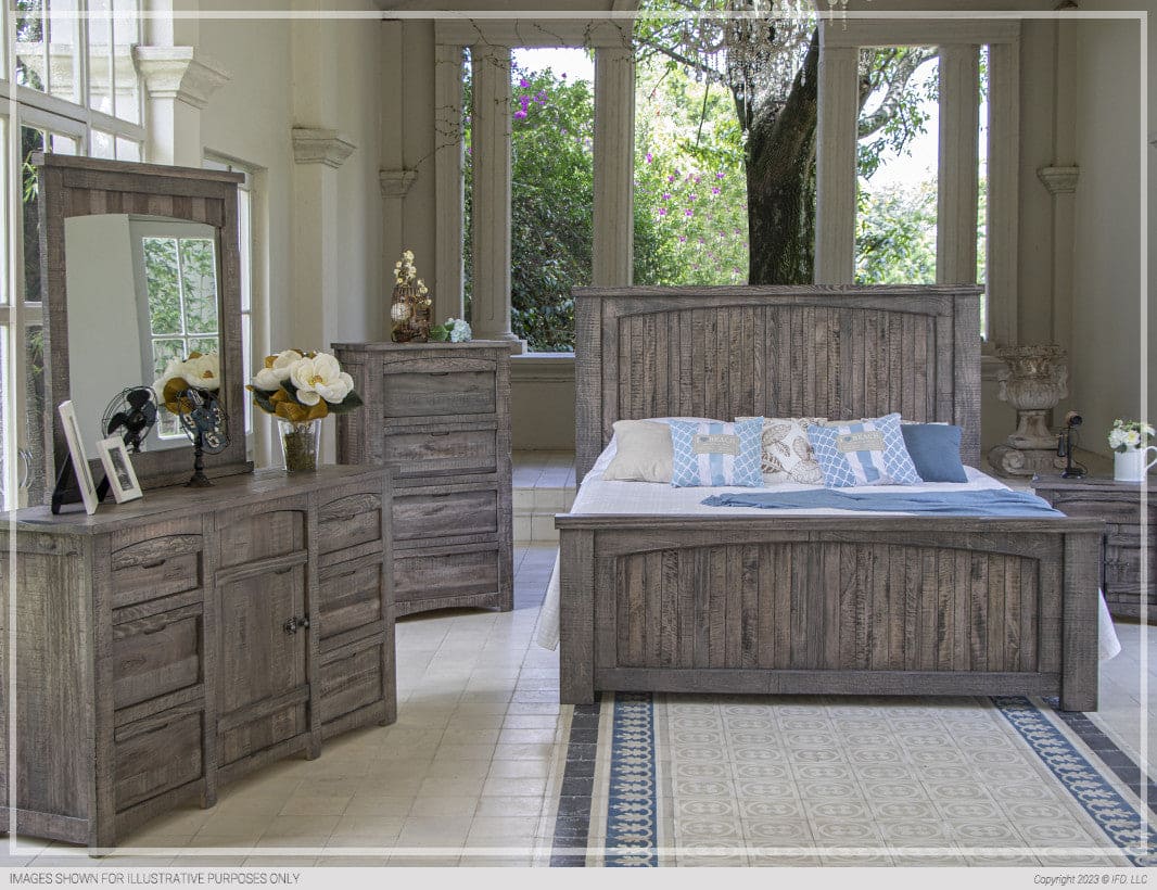 | Featured-2 | Featuring mango and solid pine construction. Mango is a durable and eco friendly species sourced from sustainable plantations. Multi-step lacquer finish provides protection and depth to the wood. Hand-brushed, distressed wood adds authentic rustic charm. Mortise and tenon construction ensure stability and durability. Microfiber-lined top drawers on Dresser and Nightstand. Wrought-iron hardware. English dovetail joinery on solid wood drawer fronts. Ball-bearing Haffele metal glides offer superior stability and smooth glide to drawers. Available in Queen & Eastern King Sizes. Requires a box spring. | |