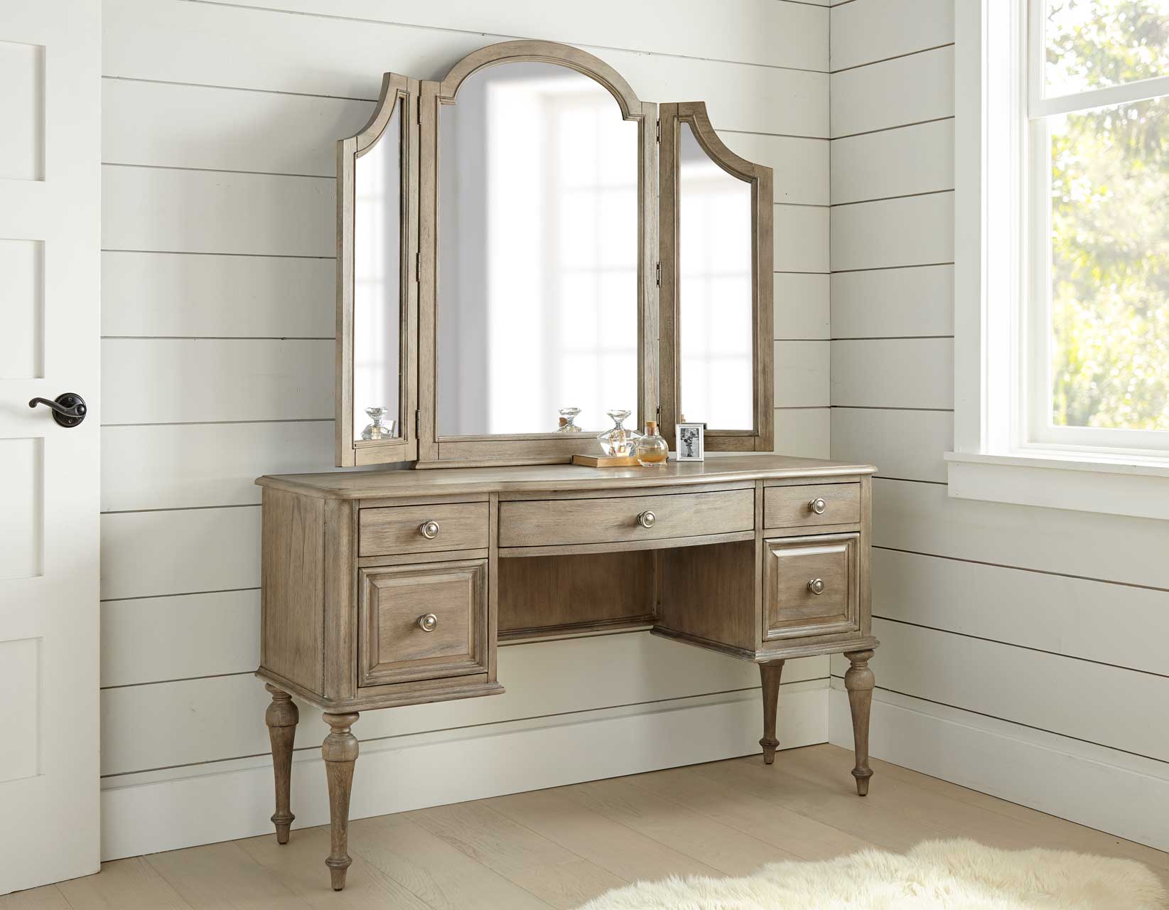 Vintage styling meets modern functionality in the Vanity from Highland Park. Shown in the Waxed Driftwood finish, this vanity offers feminine styling in a vanity great for make-up, work or school. The tri-fold mirror features tempered glass and beveled edge and is great for all angles when you are getting ready in the morning. Add the bench for a comfortable station from which to work.