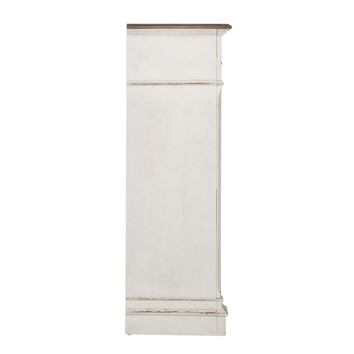 This Abbey Park drawer chest is the perfect way to accent your room with an effortless blend of European Traditional design. Weathered brown whitewash top and antique white finish, combined with heavy chipping, creates a truly unique look. The post design with fluted top accents and chamfered edges completes this traditional piece.
