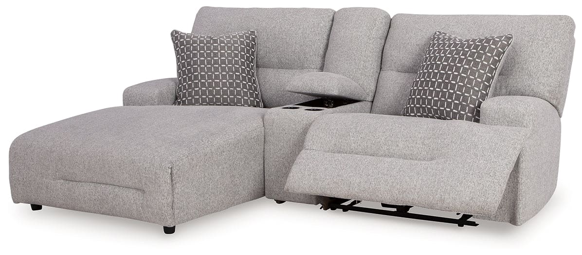 | Details | Includes 3 modular pieces: left-arm facing power reclining back chaise, console with storage and right-arm facing power recliner, "Left-arm" and "right-arm" describe the position of the arm when you face the piece, Versatile modular pieces fit together in a variety of configurations, One-touch power control with adjustable positions, Easy View™ adjustable headrest and zero-draw USB port; zero-draw technology only consumes power when the USB receptacle is in use, Easy View™ adjustable headrest puts your head and neck in optimum position for reading or watching TV even if you're fully reclined; zero-gravity mechanism allows optimum reclining comfort with infinite reclining positions at the touch of a button, Corner-blocked frame with metal reinforced seat, Attached cushions; high-quality foam cushions wrapped in poly fiber, Accent pillows included; pillows with soft polyfill, Polyester upholstery, Next-Gen Nuvella™ is a performance fabric that is soft, easy to clean, stain-resistant and durable, Clean fabric with mild soap and water, let air dry; for stubborn stains, use a solution of 4 oz. bleach to 28 oz. water, Console with 2 cup holders and hidden storage, Power cord included; UL Listed | |