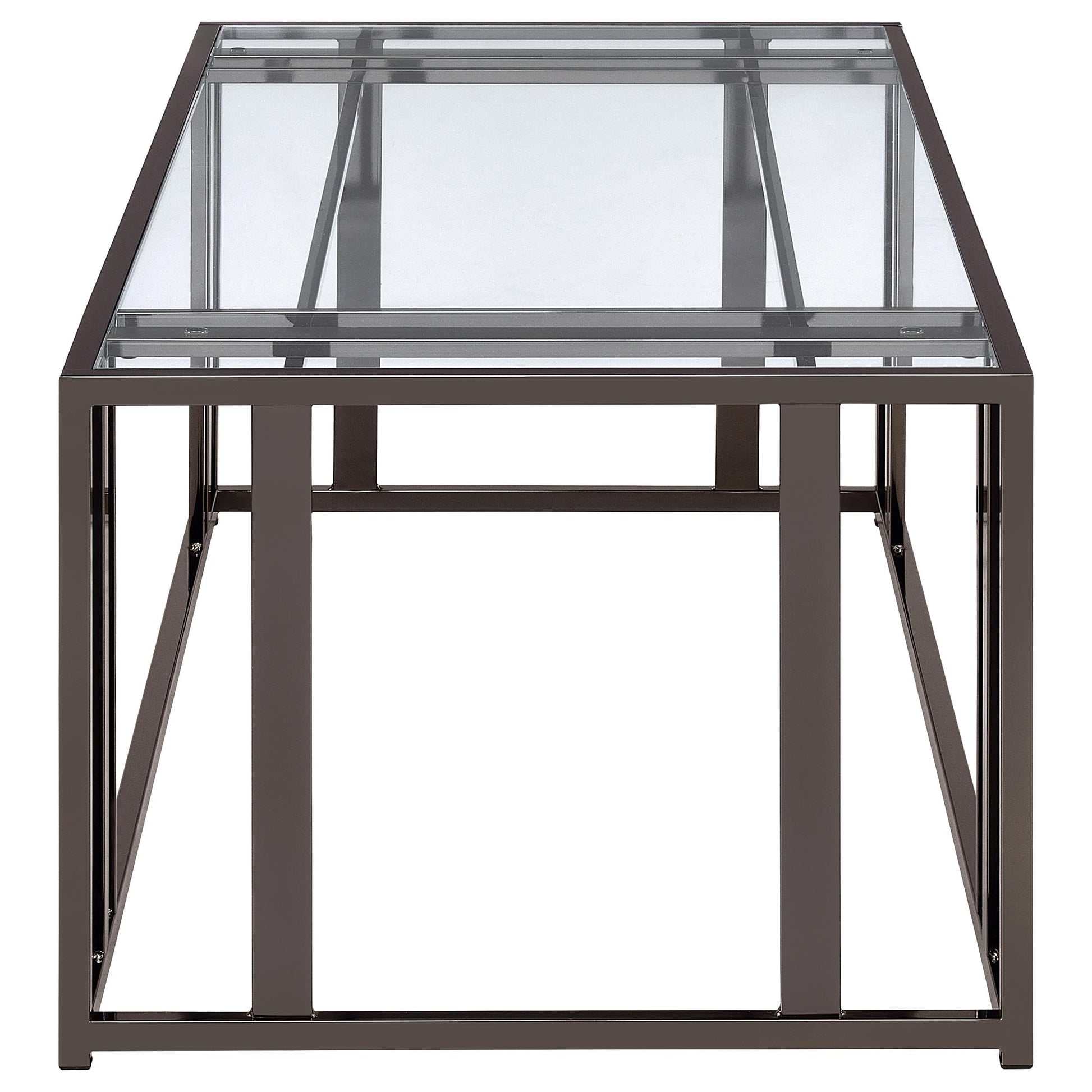 This coffee table set includes a rectangular coffee table and a matching end table, both featuring tempered glass tops and geometric bases crafted from heavy-gauge metal. The open-frame design exudes modern elegance while offering durability and functionality. Scratch-resistant materials ensure lasting quality, making the set ideal for organizing essentials or displaying decor. Its cohesive design provides a sleek, contemporary look for any living room.