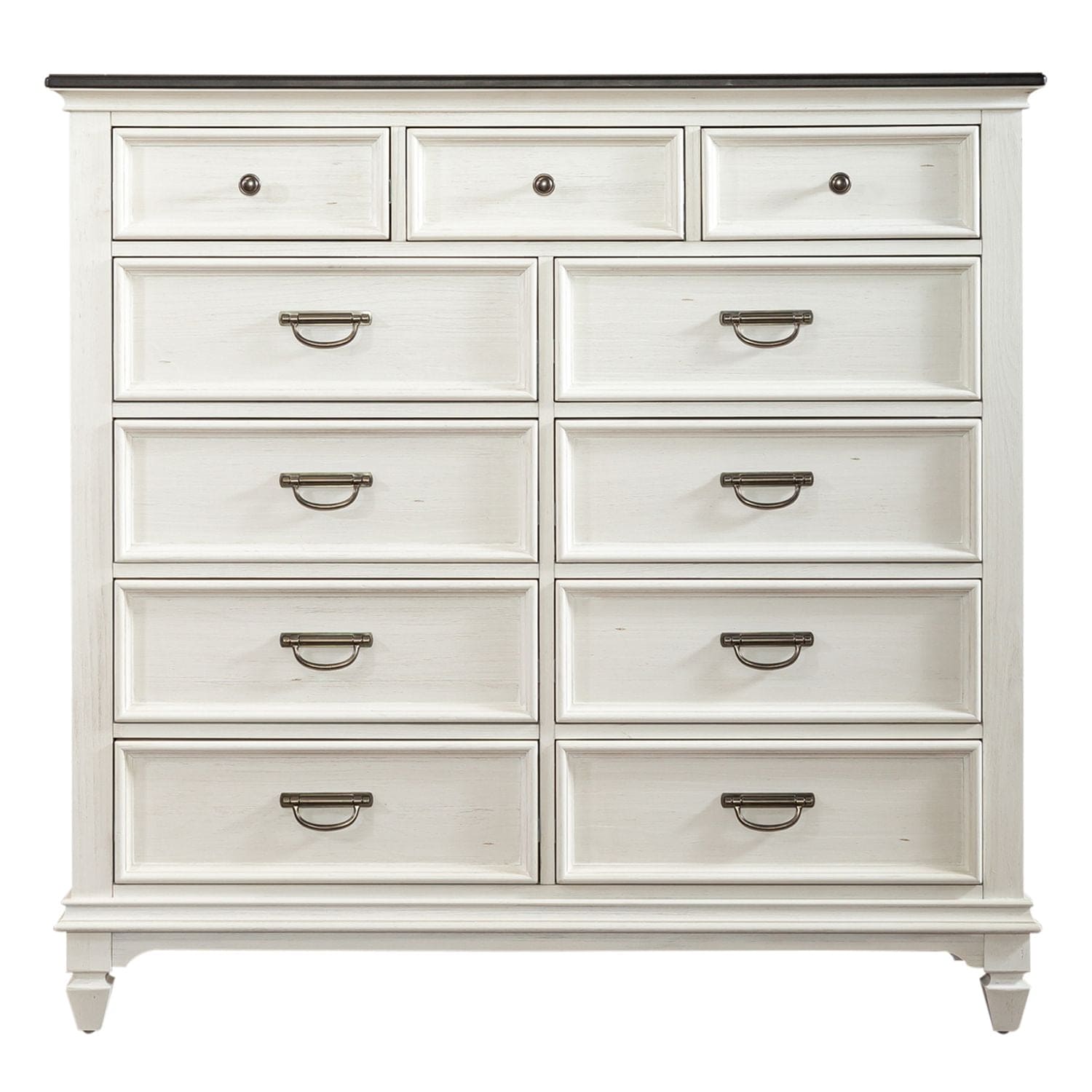 Design possibilities are endless with the Allyson Park chesser. Crafted of pine solids with cathedral white oak tops, this piece features a wire brushed white finish with charcoal tops with planked accents. The chesser has eleven wood framed full extension drawers including three smaller drawers across the top of the case that have felt lining and still offer plenty of deep storage. The bead molding, square tapered feet, and antique pewter drop bail and knob hardware offer a classic look with a casual feel. Allyson Park offers cottage styles you love in a wire brushed two tone finish that will work from the beach to the mountains to an industrial loft.