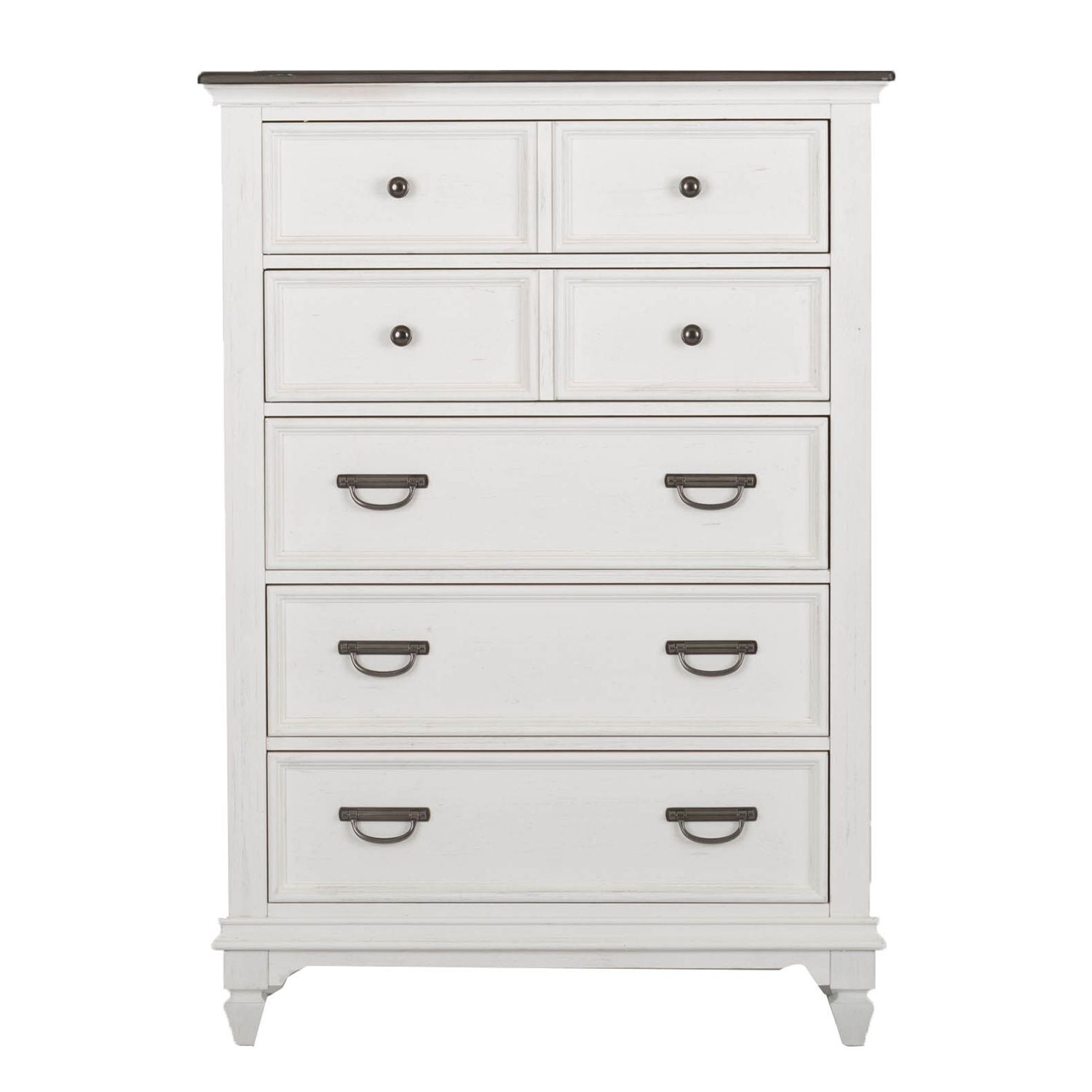 Bring beauty indoors with the Allyson Park California king panel bed, dresser, mirror, and chest. Crafted of pine solids and veneers with cathedral white oak tops, this kit features a wire brushed white finish with planked charcoal tops, bead molding, full extension drawers with felt lined top drawers, and is accented with antique pewter knob and drop bail hardware. The panel bed features a planked headboard and footboard in a two-tone finish. The dresser has eight drawers of varying sizes and pairs well with the crown mirror with its bead molding and beveled edge. The chest offers an additional five drawers of storage, with the top two drawers having bluff-cut drawer fronts to give the illusion of multiple smaller drawers, while still offering deep storage. Allyson Park offers cottage styles you love in a wire brushed two tone finish that will work from the beach to the mountains to an industrial loft.