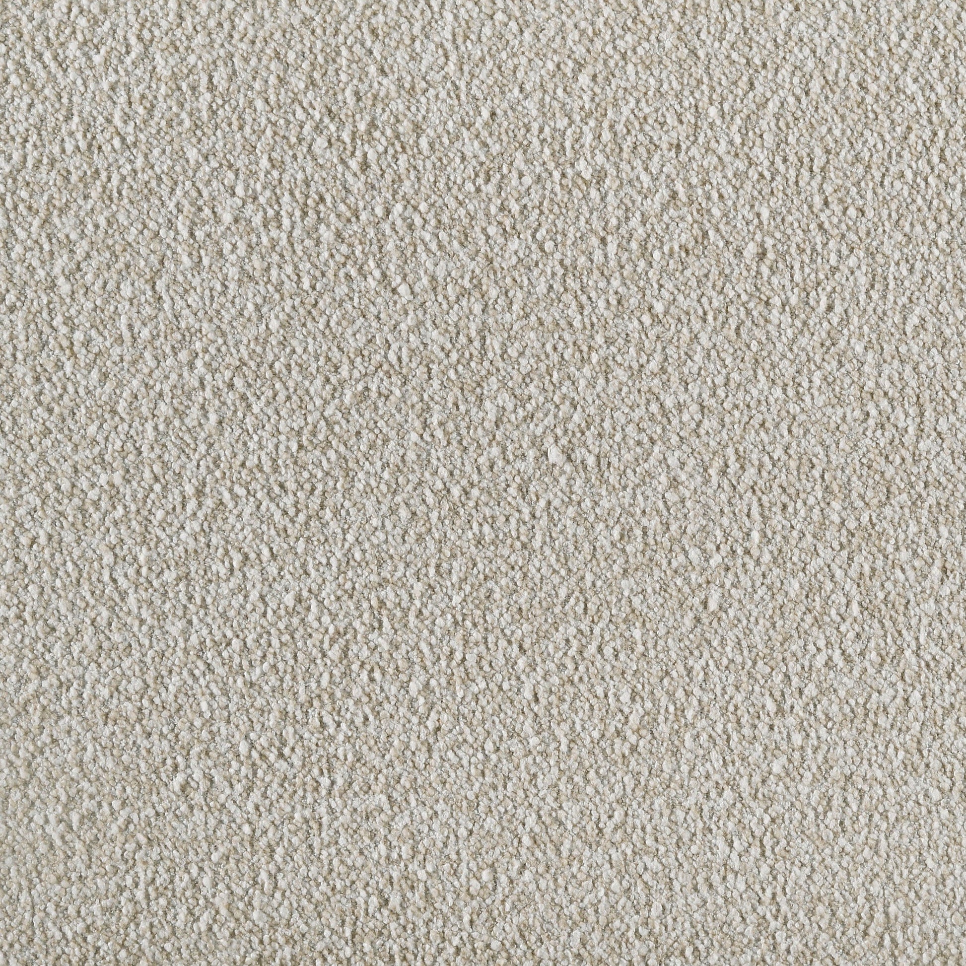 • Vertical channeled beige boucle upholstered headboard adds texture