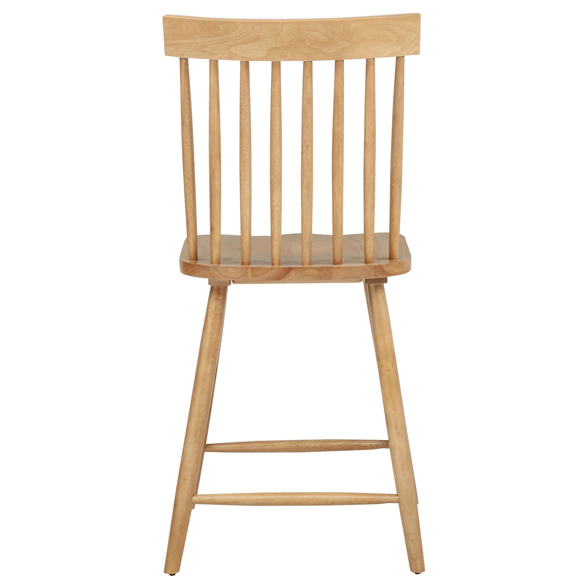 Classic and casual with a fresh farmhouse flair, this Windsor-style counter height chair features a high spindle back and gently contoured seat for timeless comfort. The clean silhouette is crafted from solid rubberwood with a rich wood veneer that enhances its natural grain. Angled legs with double stretchers offer reliable support and charm. Ideal for kitchen islands, pub tables, or counter-height dining spaces.