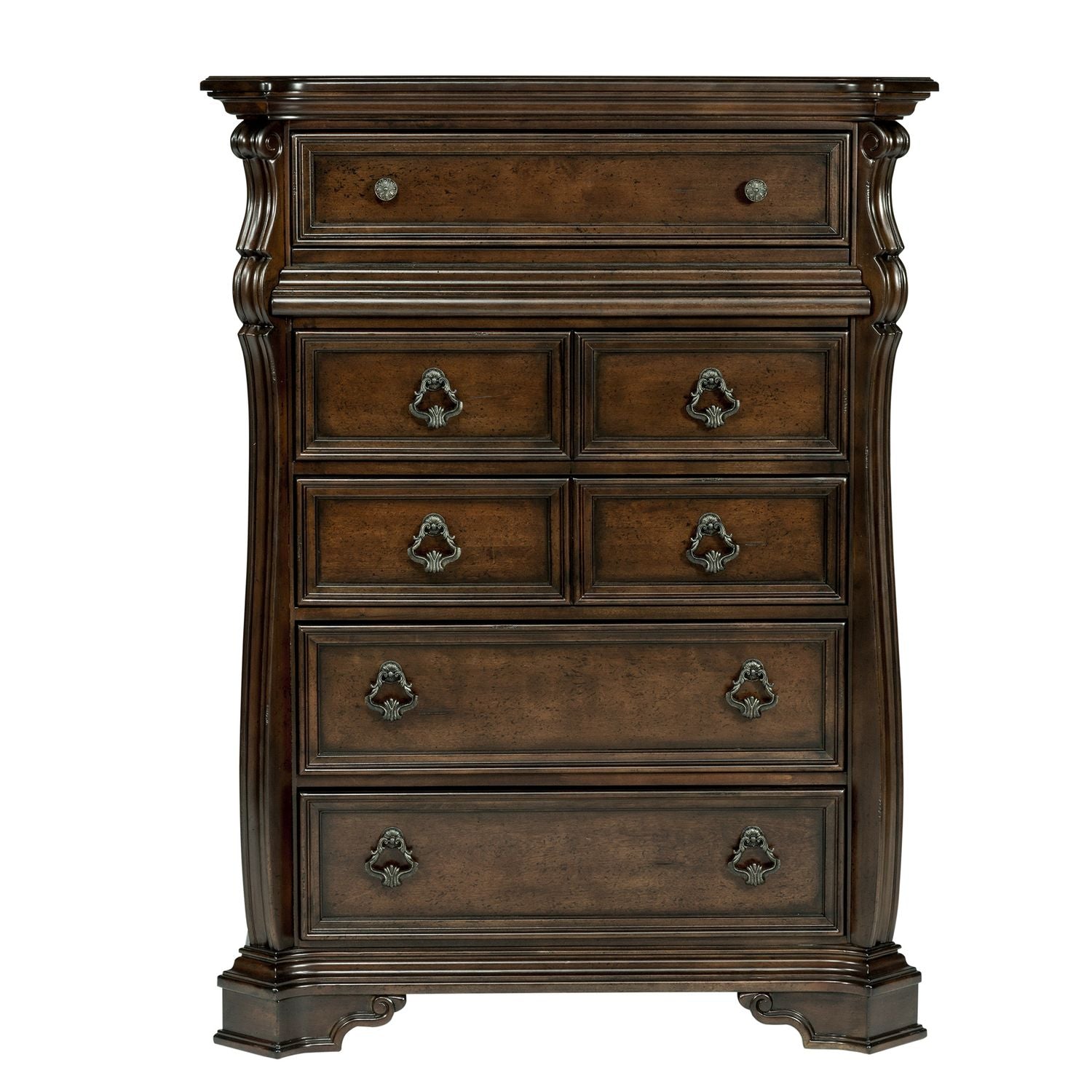 Opt for an elegant display. A refined yet relaxed feel describes the Arbor Place California king sleigh bed, dresser, mirror, and chest. Crafted of poplar solids, birch veneers and metal, this kit features a brownstone finish, four-way match fancy face veneer tops, canted corners and shaped pilasters, a hidden drawer, full extension drawers with felt lined top drawers, scrolled bracket feet, and is accented with a custom designed drop ring and knob hardware. This sleigh bed features rope twist cap rails on the headboard and footboard. The headboard also has scrolled inserts finished in a burnished brass metal. The dresser has eight drawers, including the two hidden drawers. The landscape mirror features a beveled edge and has scrolled metal inserts to match the headboard and can be attached to the dresser using the included bolt-on supports. The chest offers six drawers of storage, with two drawers having bluff-cut drawer fronts giving the illusion of multiple smaller drawers, while still offering deep storage. Arbor Place bridges a combination of bold and dramatic scaling with soft shapes creating a casual, traditional style.
