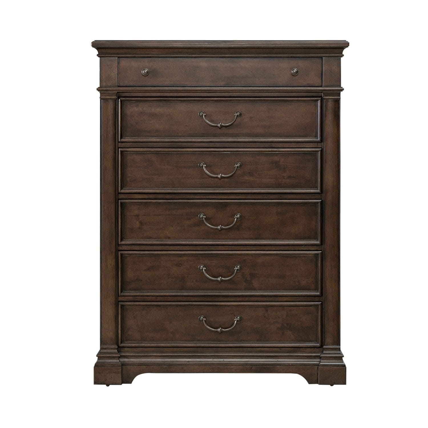 In a world of fleeting trends, the Arden Road 5 drawer chest stands as a beacon of enduring elegance. Crafted with excellence using Poplar solids and Rustic Alder veneers, this chest features a Satin Cherry finish. The chest showcases column pilasters that flow into block feet. The top drawer offers clean styling with a flat cut drawer front, while the bottom drawers feature bead molding accents that frame each drawer. The top drawer has premium felt lining, while the bottom drawer is lined with cedar. Soft closing drawer guides add an elegant touch. The chest is accented with Antique Brass bail and knob hardware. When you invite the Arden Road 5 drawer chest into your space, you’re not just selecting furniture, you’re curating a legacy that will grace your family for years to come. With the Arden Road collection, each piece is an investment. A piece of history waiting to be passed down through the generations. A living testament to the art of design, comfort, and storytelling.
