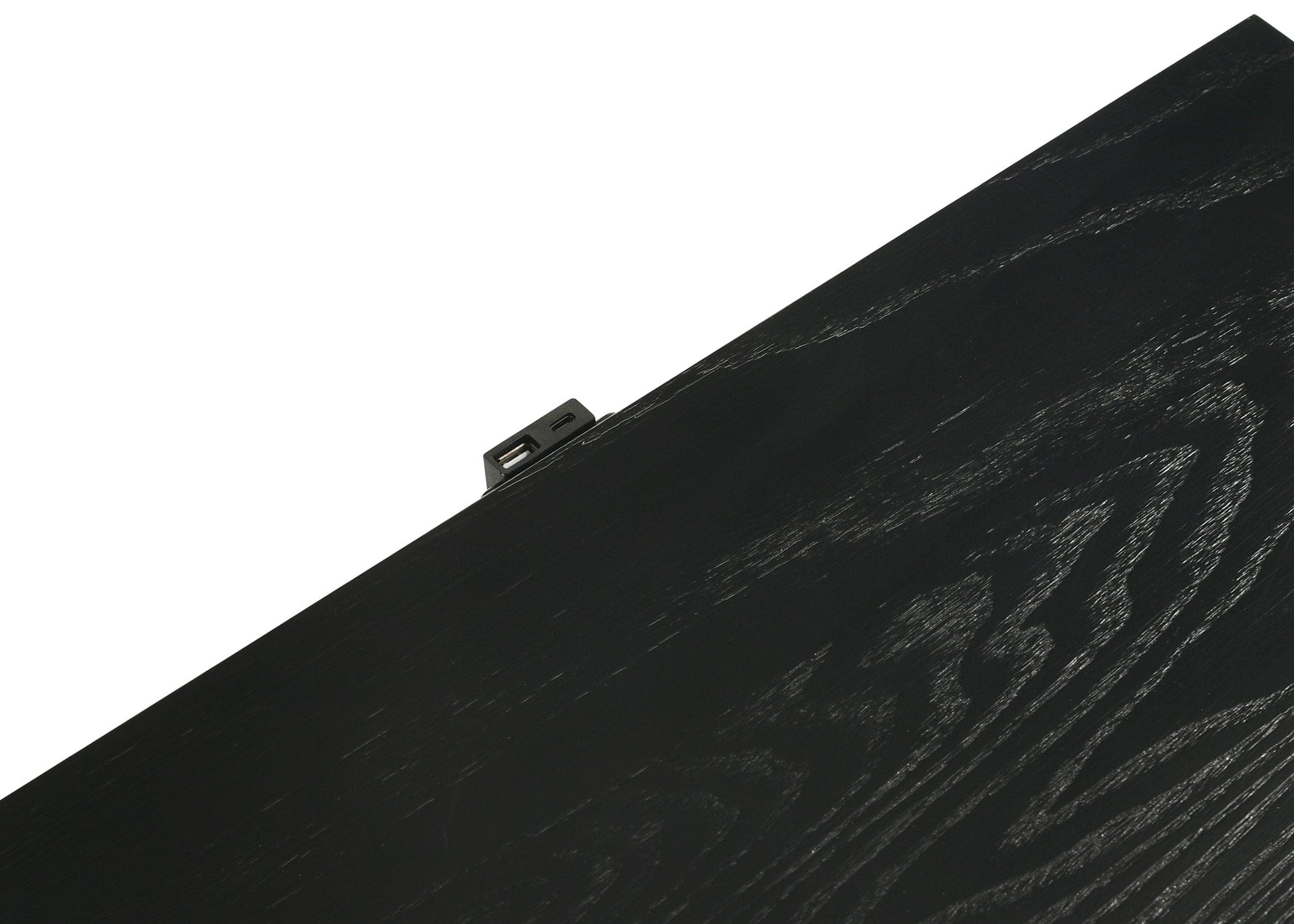 Put a fresh spin on your bedroom with the addition of a modern nightstand. Its three drawers provide plenty of storage at your bedside, great for books and personal items. The top drawer includes felt linking top protect important items, and a built-in USB port adds access for easily charging your phone overnight or while lounging in bed. The nightstand features a crisp black wire brushed finish that enhances its wood grain details, and gold finish ball knobs and legs add the perfect dose of contrasting warmth. Rounded corners soften the silhouette while a generous top is just right for a reading light or decor.