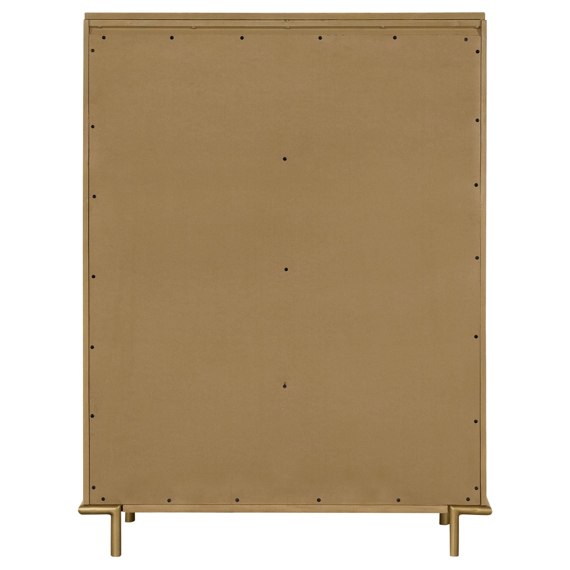 This mid-century modern five-drawer chest combines refined simplicity with thoughtful detail. A warm sand wash finish highlights the wire-brushed texture of the wood, creating natural depth and dimension. The aged brass knobs and slim metal legs add a sophisticated metallic accent, while softly rounded corners lend a smooth, contemporary look. A felt-lined top drawer offers a secure place for delicate items, making this chest a stylish and functional addition to any modern or transitional bedroom.