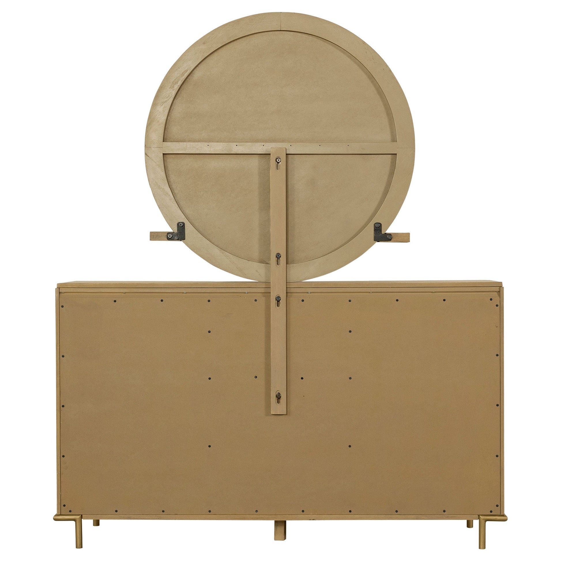 This mid-century modern dresser and mirror set blends elegant design with versatile functionality. The eight-drawer dresser features a wire-brushed sand wash finish, aged brass knobs, and slender metal legs for a refined touch. Felt-lined top drawers offer safe storage for delicate items, while softly rounded corners add subtle sophistication. Above, the round mirror includes a felt-lined tray and can be mounted to the dresser or hung independently on the wall, offering flexible styling and practical beauty for any bedroom.