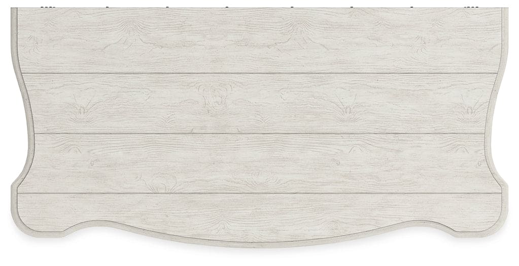 Add a touch of romance to your bedroom with this chest of drawers. Its antiqued white painted finish and serpentine-shaped silhouette details are the picture of easy elegance. Five spacious drawers offer ample storage space, while custom-designed bar pulls add originality.