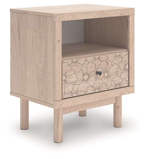 Looking for a nightstand that's both playful and practical for your little one? This piece is just the ticket. Its charming design and light wood finish create a whimsical and inviting atmosphere. A floral-patterned drawer adds a free-spirited vibe and plenty of bedside storage, so there's no excuse for a messy room. And a USB charger located on the back makes this nightstand that much more functional.