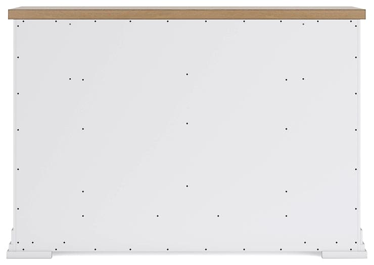 Casual style with substance. This two-tone dresser raises the bar on comfortably cozy design in your soothing sanctuary. A sturdy silhouette with a classic white finish and black metal hardware exudes modern farmhouse vibes. The butcher block oak veneer top adds a relaxed aesthetic. And this charmingly curated piece is spacious enough for all your essentials.