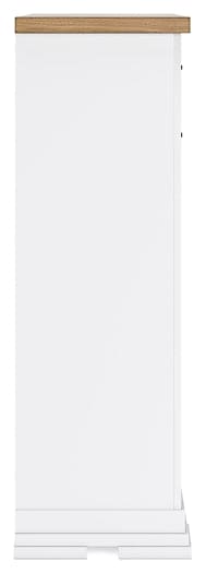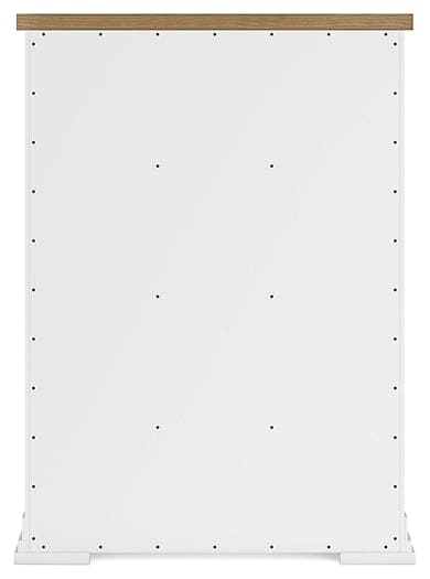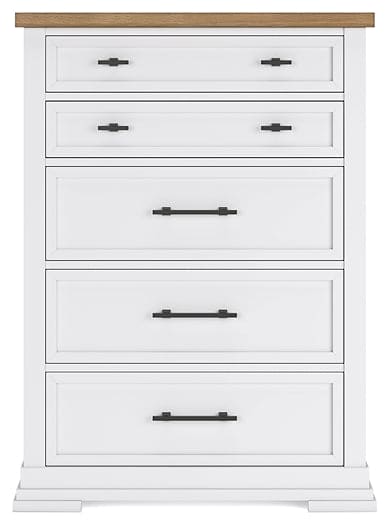 Casual style with substance. This two-tone chest of drawers raises the bar on comfortably cozy design in your soothing sanctuary. A sturdy silhouette with a classic white finish and black metal hardware exudes modern farmhouse vibes. The butcher block oak veneer top adds a relaxed aesthetic. And this charmingly curated piece is spacious enough for all your essentials.