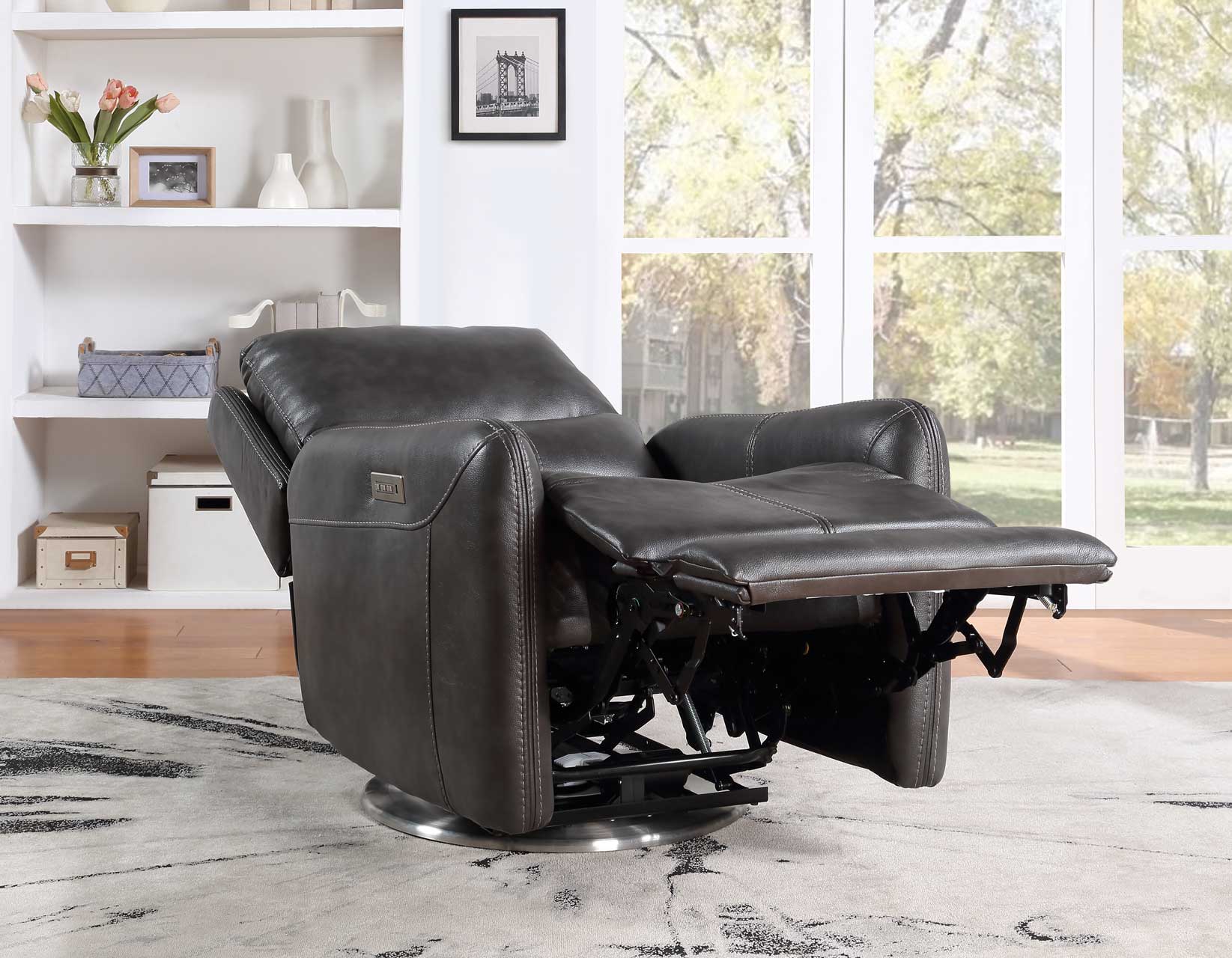 Modern elegance in a triple-power reclining package, Athens shows that style and function can come in one package. This sleek recliner features pencil arms and power footrest, power headrest and power lumbar all in a chair that swivels 360 degrees. Covered in a charcoal faux-leather with baseball stitching, Athens is sure to become the favorite chair in any household.