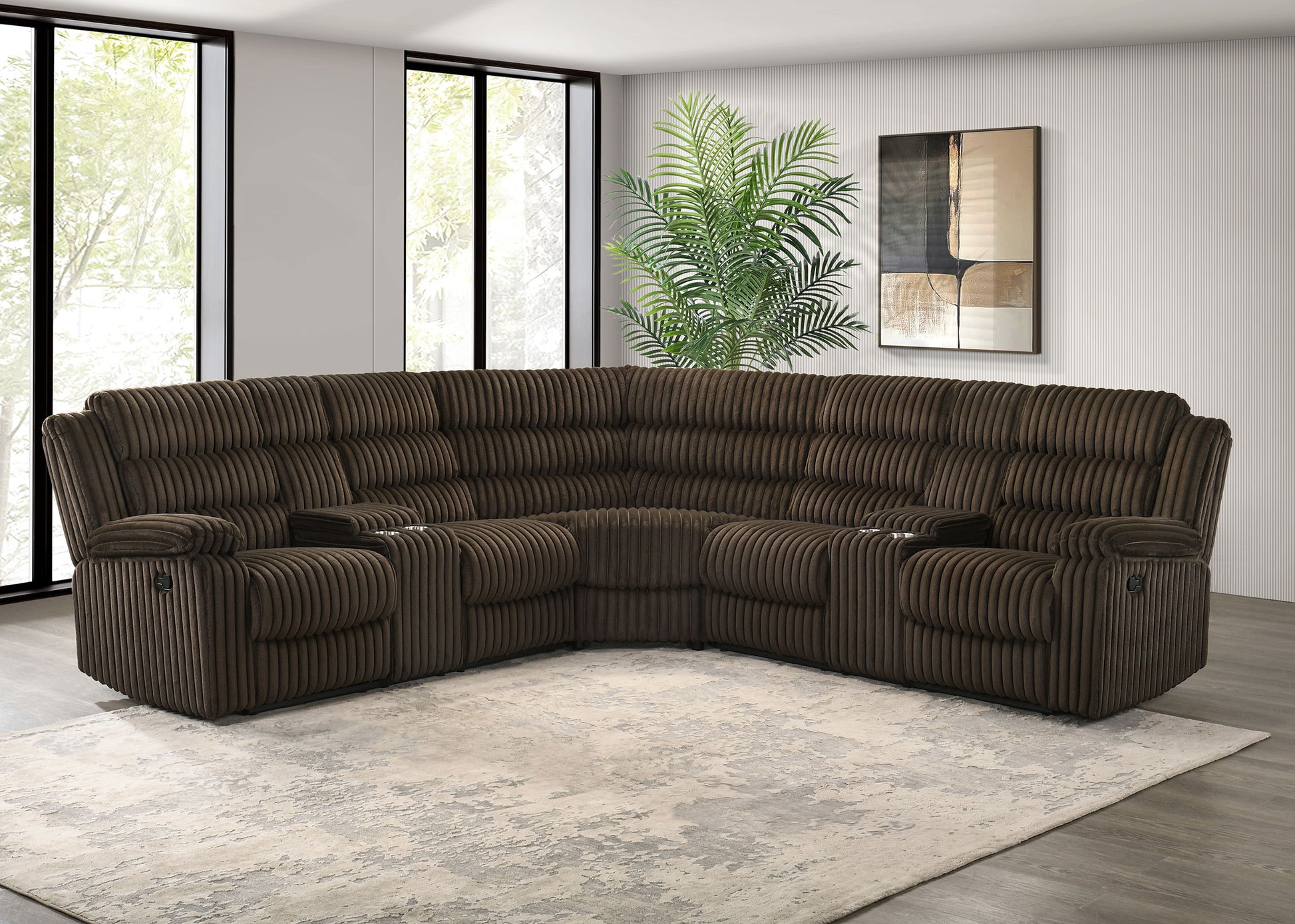 Unwind in sculpted comfort with this reclining sectional sofa, where bold texture meets irresistible softness. Wrapped in wide-wale corduroy upholstery, its velvety ribbed finish creates visual depth and an inviting touch. Deep channel tufting enhances the plush profile, while dual consoles offer lift-top storage and stainless steel cup holders. With pocket coil seating beneath every cushion, this sectional is a luxurious retreat for everyday lounging and connection.