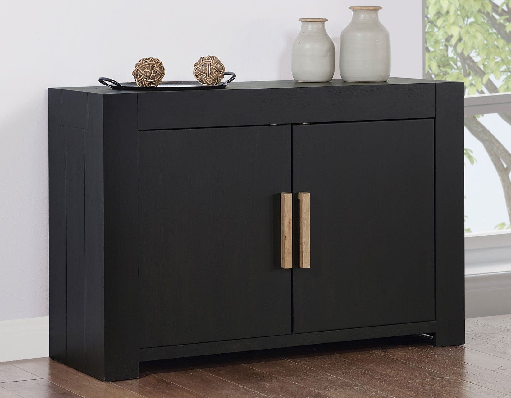 The Aubrey black-finished Server offers ample storage for all your dining essentials. With Craftsman styling, clean lines, and substantial proportions, it exudes a primitive design aesthetic. Two adjustable shelves enable you to customize your space precisely to your needs, while the contrasting driftwood wood pulls and driftwood interior facilitate mixing and matching with other driftwood dining items, especially those in the Aubrey collection.