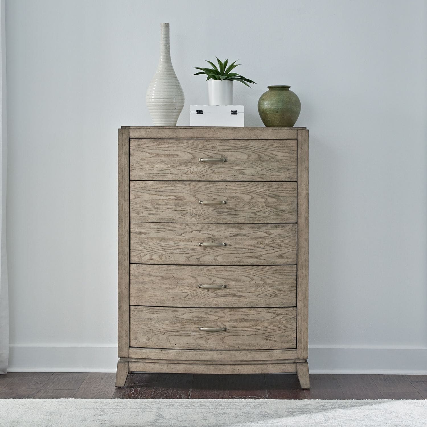 Create a calm and peaceful oasis with the Avalon 5 drawer chest. Crafted with excellence using Rubberwood solids and Split Heart White Oak veneers, this chest features a Burnished Beige finish. The journey into the Avalon 5 drawer chest begins with its unique bow shaping; a graceful curve that lends a touch of artistry to its silhouette. This subtle design element, combined with step top molding, creates a visual masterpiece that seamlessly blends traditional charm with contemporary flair. The Avalon chest isn’t just a utilitarian piece; it is a work of craftsmanship that transcends the ordinary. The floating style base, supported by angled tapered feet, adds a sense of lightness and modernity to the dresser. The illusion of the chest hovering above the floor creates an airy ambience, making it the perfect fit for modern living spaces. The angled tapered feet provides a nod to mid-century design, adding a touch of nostalgia to the chest’s overall aesthetic. The functionality of the Avalon chest unfolds with its 5 spacious drawers. The top drawer, lined with premium felt, offers a luxurious haven for delicate items and cherished belongings. The bottom drawer offers the embrace of a cedar lined panel. Each drawer is accented with Antique Brass bar pull hardware. The Avalon chest is a timeless addition where every detail speaks of sophistication and thoughtful craftsmanship. Transform your bedroom into a haven of grace and convenience with the Avalon 5 drawer chest.