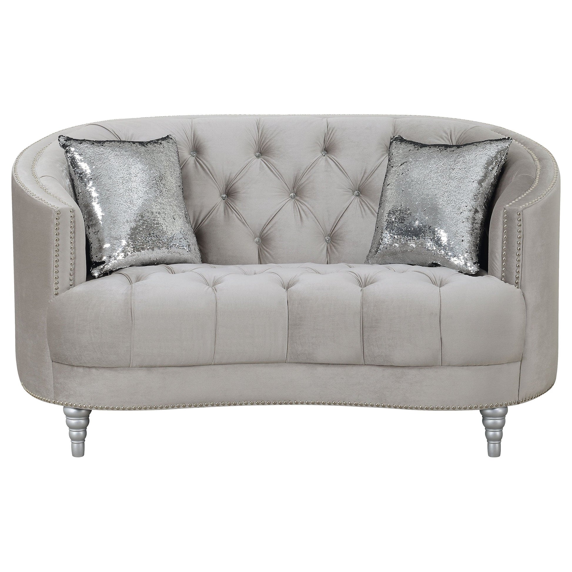 Classic and elegant, this two-piece living room set looks great with a chic aesthetic. Featuring high rolled and arms and button tufting, the traditional silhouettes of the sofa and loveseat emit an elegant aura. Perfect for a classic motif, the grey fabric upholstery adds texture to any space. A decorative nail head trim lines the cushions and subtle crystal details give this stunning piece all-over glam. Dress up any space with the smooth features and neutral hues.