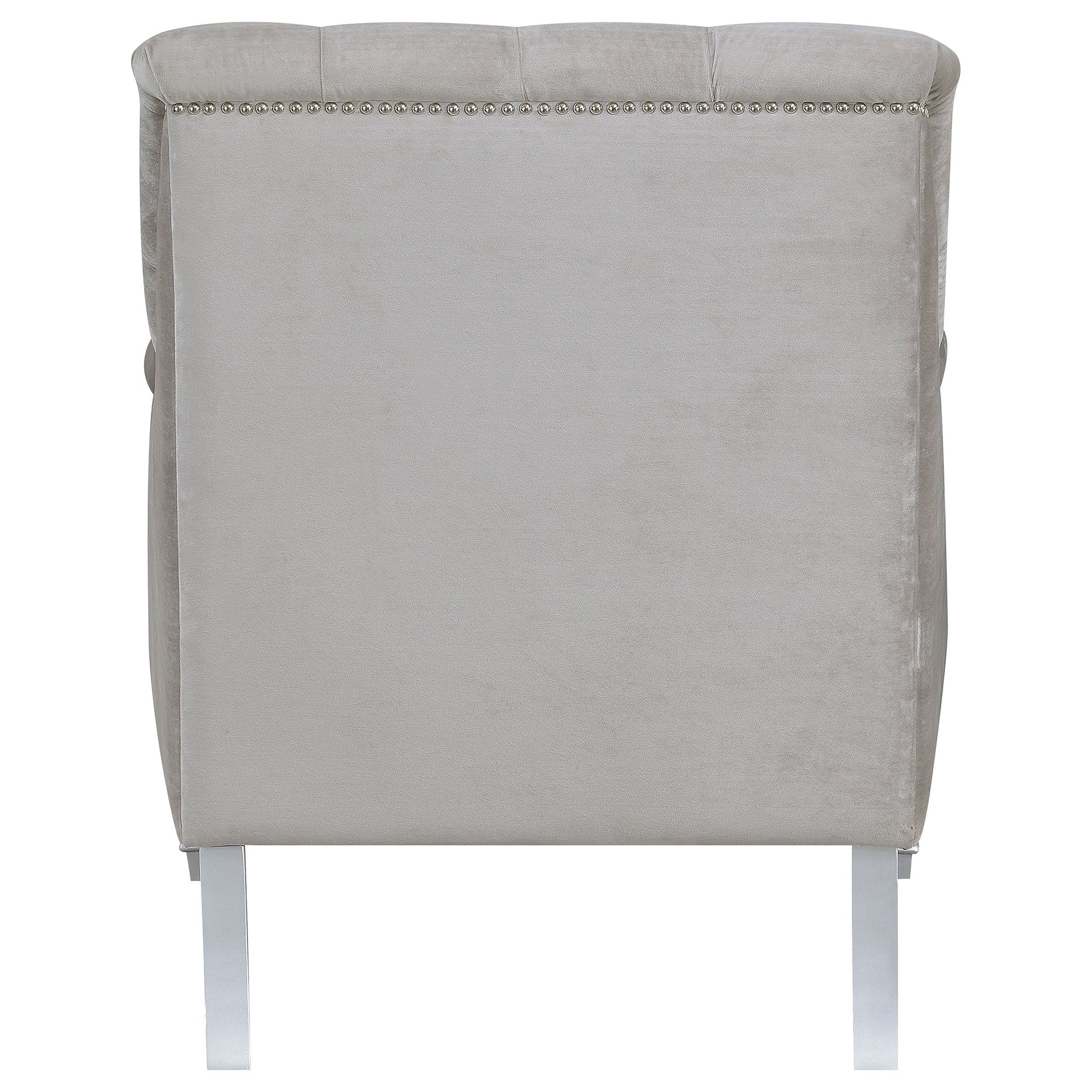 • Soft, grey velvet upholstery with deep rhinestone tufting