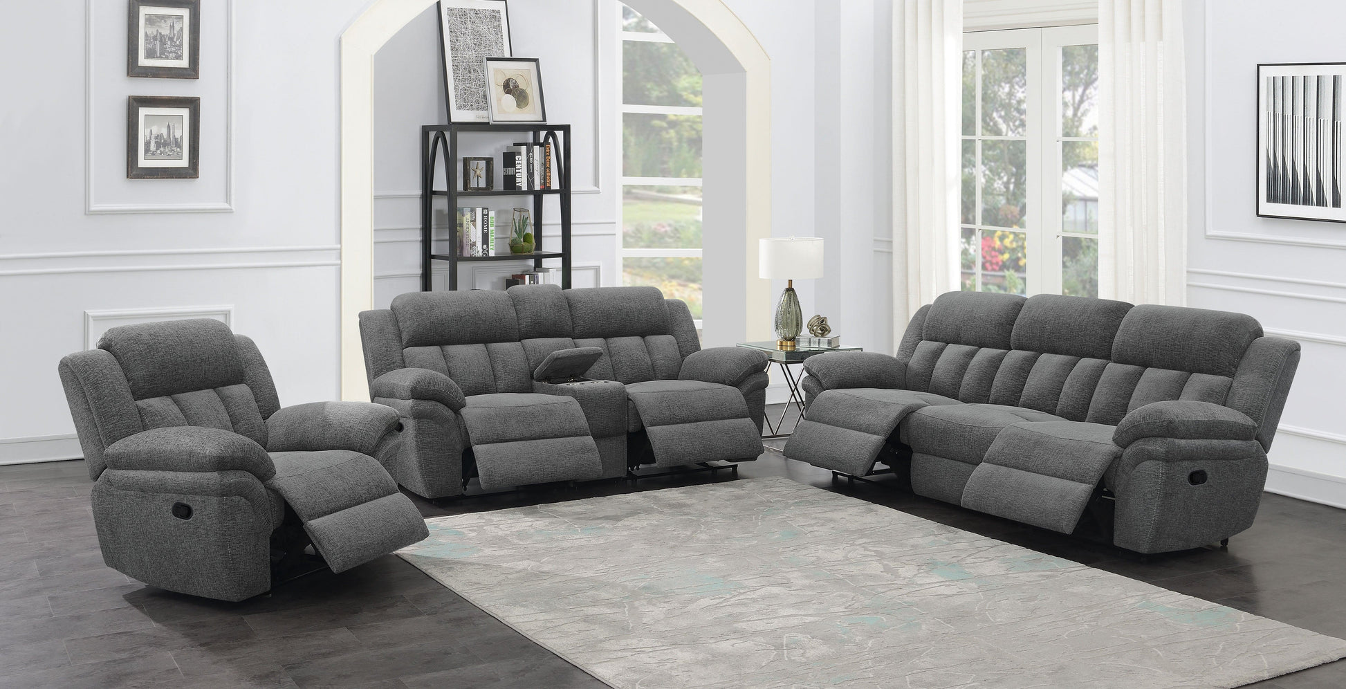 Sink into the cozy comfort of this manual glider recliner, upholstered in soft charcoal fabric. Designed with wide pillow arms and a plush backrest, this recliner features supportive pocket coil seating and a cool gel memory foam layer to enhance breathability and long-lasting relaxation. Its smooth gliding motion and inviting profile make it the perfect addition to any casual living space or entertainment room.