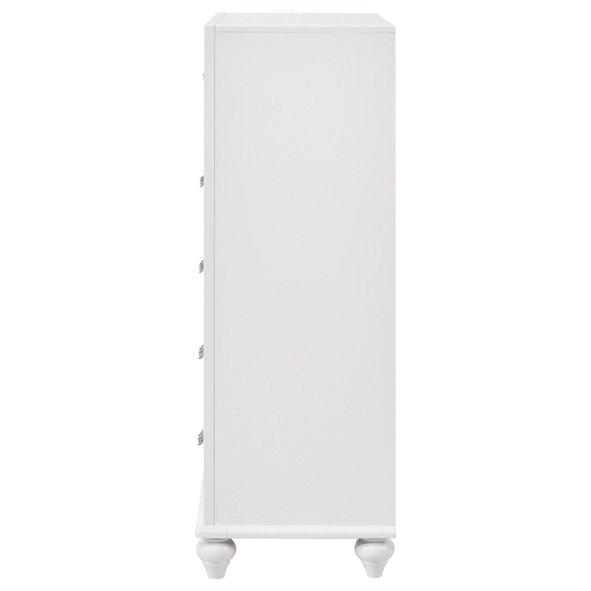 Bring sparkling sophistication to your bedroom with this five-drawer chest. The top drawer is accented with glittery acrylic panels that shimmer against the crisp white finish, while faceted crystal hardware adds a glamorous finishing touch. Sculpted bun feet introduce a classic detail that balances the modern design. Built with a sturdy frame of solid rubberwood and engineered wood with okume veneer, this chest offers durability along with generous storage space for everyday essentials.