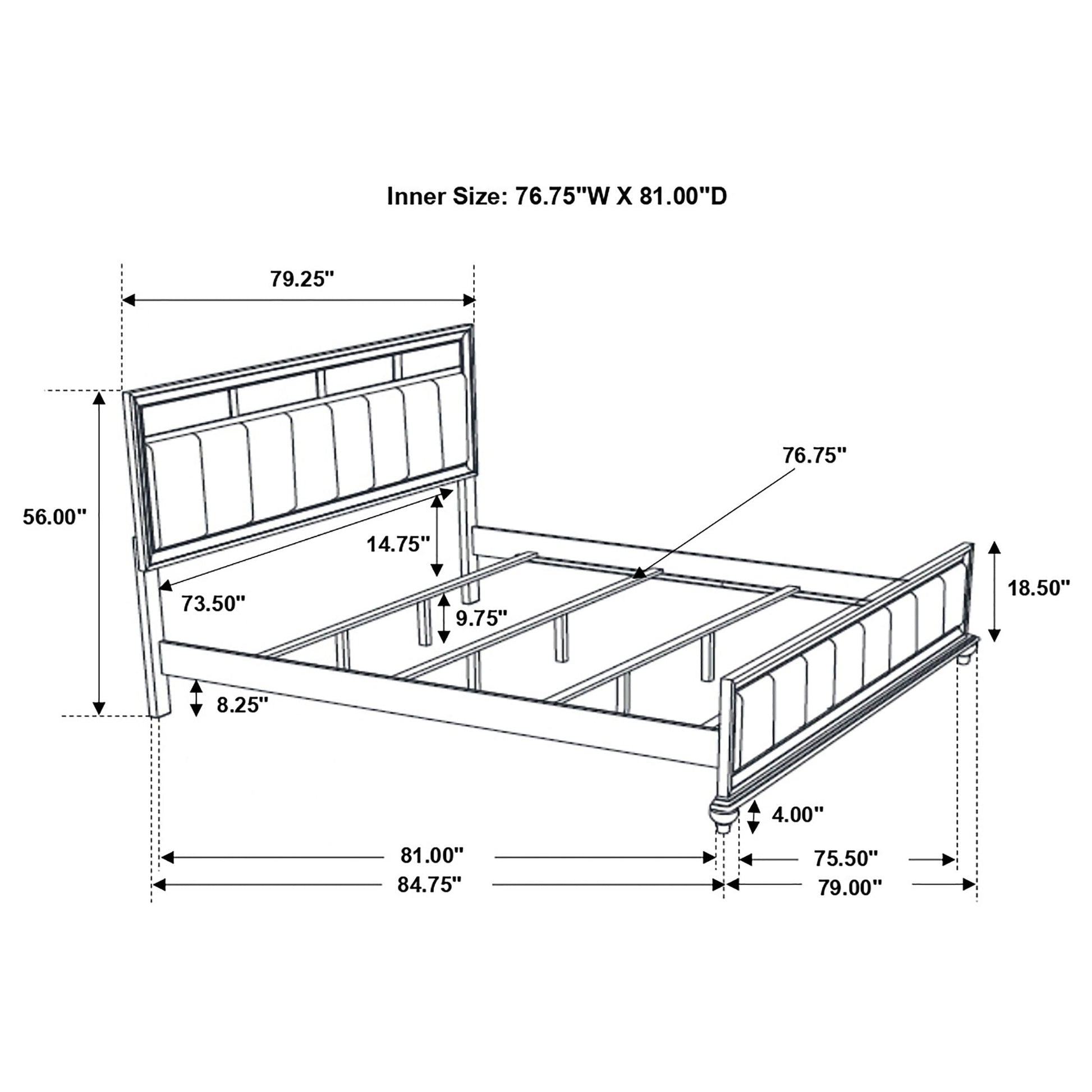 • Eastern king panel bed in white with metallic leatherette upholstered panels