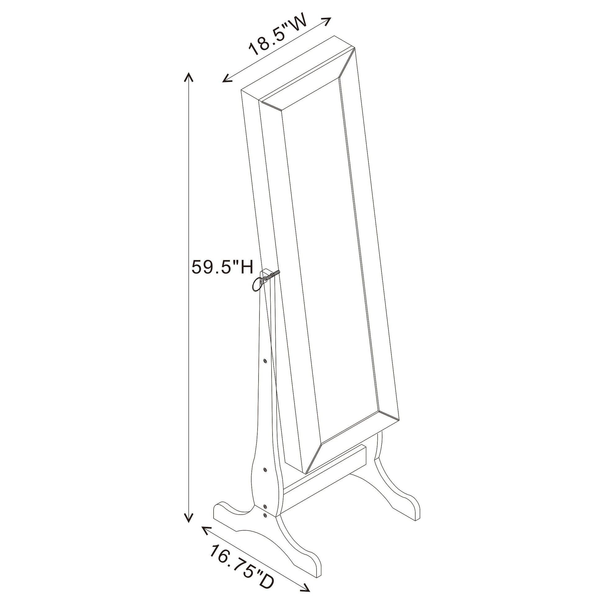 This dual-purpose jewelry Cheval mirror adds practicality to style. It's constructed five feet high to give you plenty of area to check your look from head to toe. Opening up to a green felt-lined storage with enough shelves and a small drawer, it also serves as a jewelry armoire. A four-inch deep jewelry box is built in to hold valuable accessories like watches and bracelets. The mirror is finished in white and tilts for convenience.