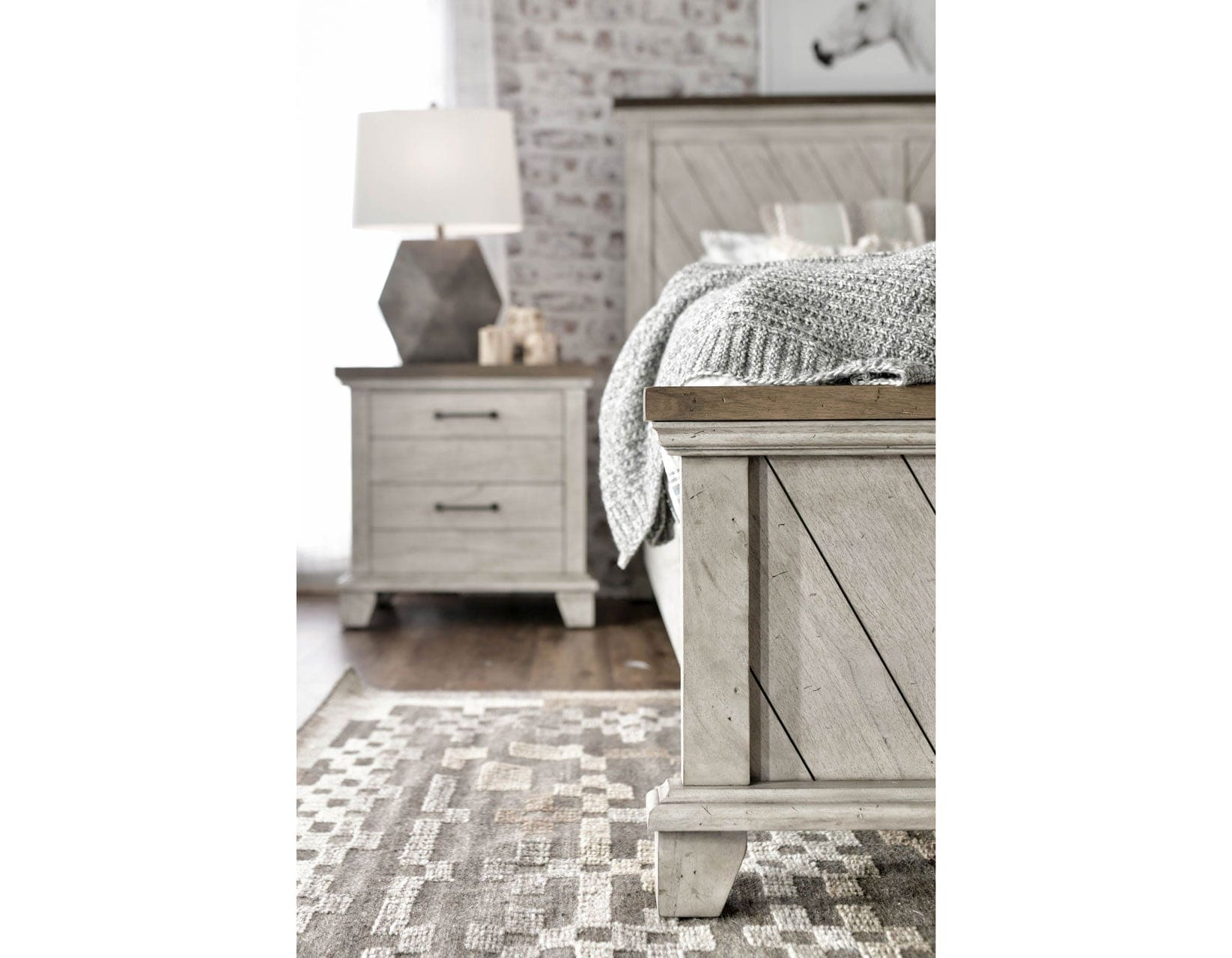 A rustic, farmhouse-inspired bedroom, Bear Creek features a white-smoke finish that contrasts beautifully with honey-smoke stained tops and cap rails. The chevron patterned headboard and footboard is offered in King and Queen sizes and the bedroom collection offers a variety of storage items with ultra-deep drawers supported by side drawer glides for easy operation.