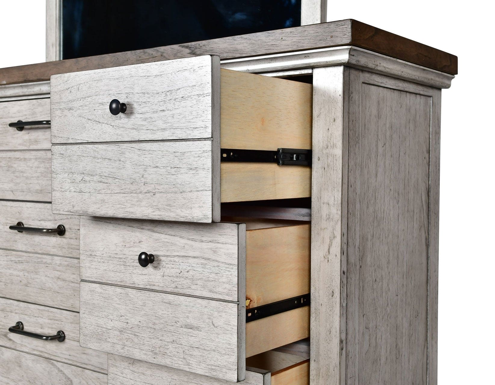 A rustic, farmhouse-inspired bedroom, Bear Creek features a white-smoke finish that contrasts beautifully with honey-smoke stained tops and cap rails. The chevron patterned headboard and footboard is offered in King and Queen sizes and the bedroom collection offers a variety of storage items with ultra-deep drawers supported by side drawer glides for easy operation.