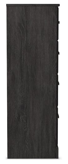 With its clean-lined look and modern attitude, this chest of drawers is a fresh style awakening. A warm charcoal hue over replicated oak grain easily complements other furniture finishes. Smooth drawer fronts with antiqued pewter-tone handles complete the aesthetic.