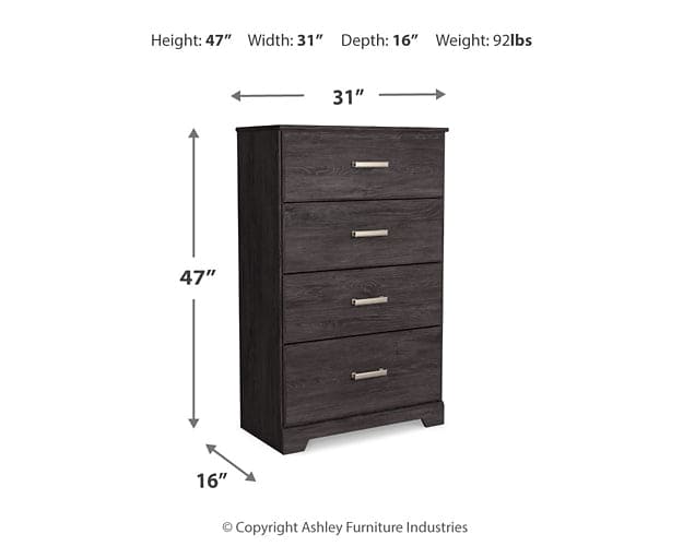 | Details | Made of engineered wood (MDF/particleboard) and decorative laminate, Dark charcoal finish over replicated oak grain with authentic touch, Antiqued dark pewter-tone handles, 4 smooth-gliding drawers, Safety is a top priority, clothing storage units are designed to meet the most current standard for stability, ASTM F 2057 (ASTM International), Drawers extend out to accommodate maximum access to drawer interior while maintaining safety | |