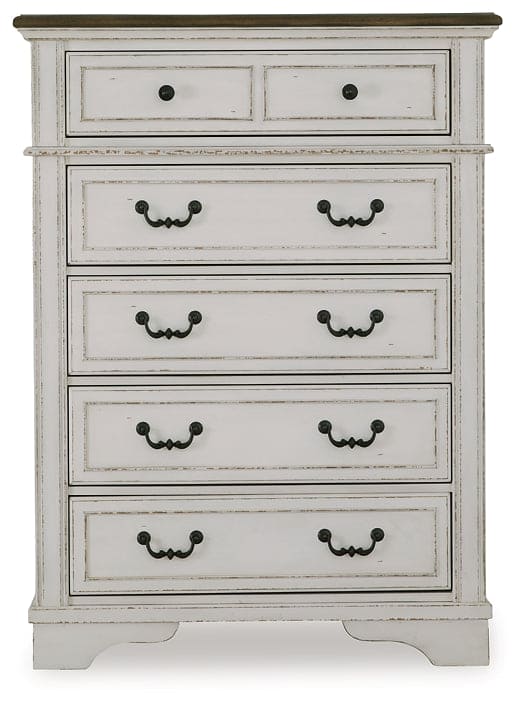 Traditional design. Casual appeal. You can have it all with this chest of drawers. A relaxed two-tone aesthetic merges with ornate profiled drawer fronts and pilasters to give the distinctive piece an allure all its own. Expansive drawers with quality dovetail construction and dark bronze-tone hardware reflect attention to detail from the inside out.