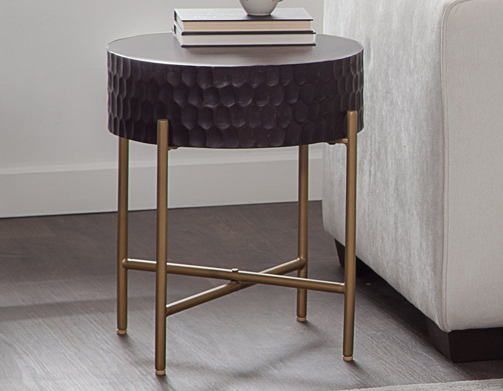 The Bobbi Solid Wood End Table blends artisanal texture with modern elegance in a compact, functional form. Crafted from solid mango wood, its hand-sculpted honeycomb sides reveal the wood’s natural grain, enhanced by a burnished espresso finish. A matte brass iron base adds striking contrast and features a cross-stretchered design for lasting support. Perfect as a standalone accent or paired with the Bobbi Coffee Table, this versatile piece complements modern, industrial, or transitional interiors with refined craftsmanship and bold mixed-media design.