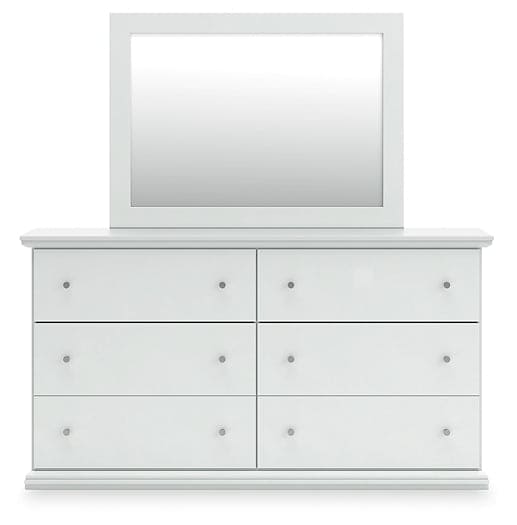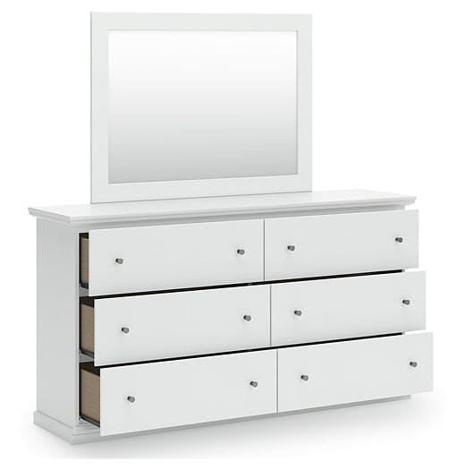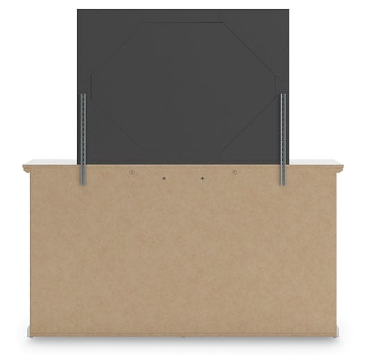Details | Includes dresser and mirror, Made of engineered wood (MDF/particleboard), Knobs with pewter-tone finish, Scalloped moulding, 6 smooth-operating drawers, Includes tipover restraint device, Mirror attaches to back of dresser; can also be mounted on wall horizontally or vertically, Safety is a top priority, clothing storage units are designed to meet the most current standard for stability, ASTM F 2057 (ASTM International), Drawers extend out to accommodate maximum access to drawer interior while maintaining safety | |