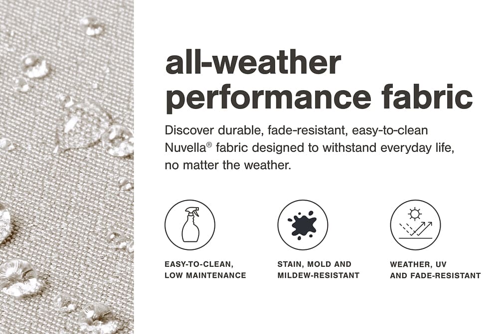 Details | Includes 8 modular outdoor lounge chairs, Aluminum frame, Solution-dyed high-performance fabric, Nuvella® is an outdoor fabric that can be cleaned and offers UV resistance, Stainless steel hardware, Designed to withstand the harsh elements of the outdoors, Cushioned seat, Back cushion included, Includes PVC protective weather cover, Clean fabric with mild soap and water, let air dry; for stubborn stains, use a solution of 1 cup bleach to 1 gallon water | |