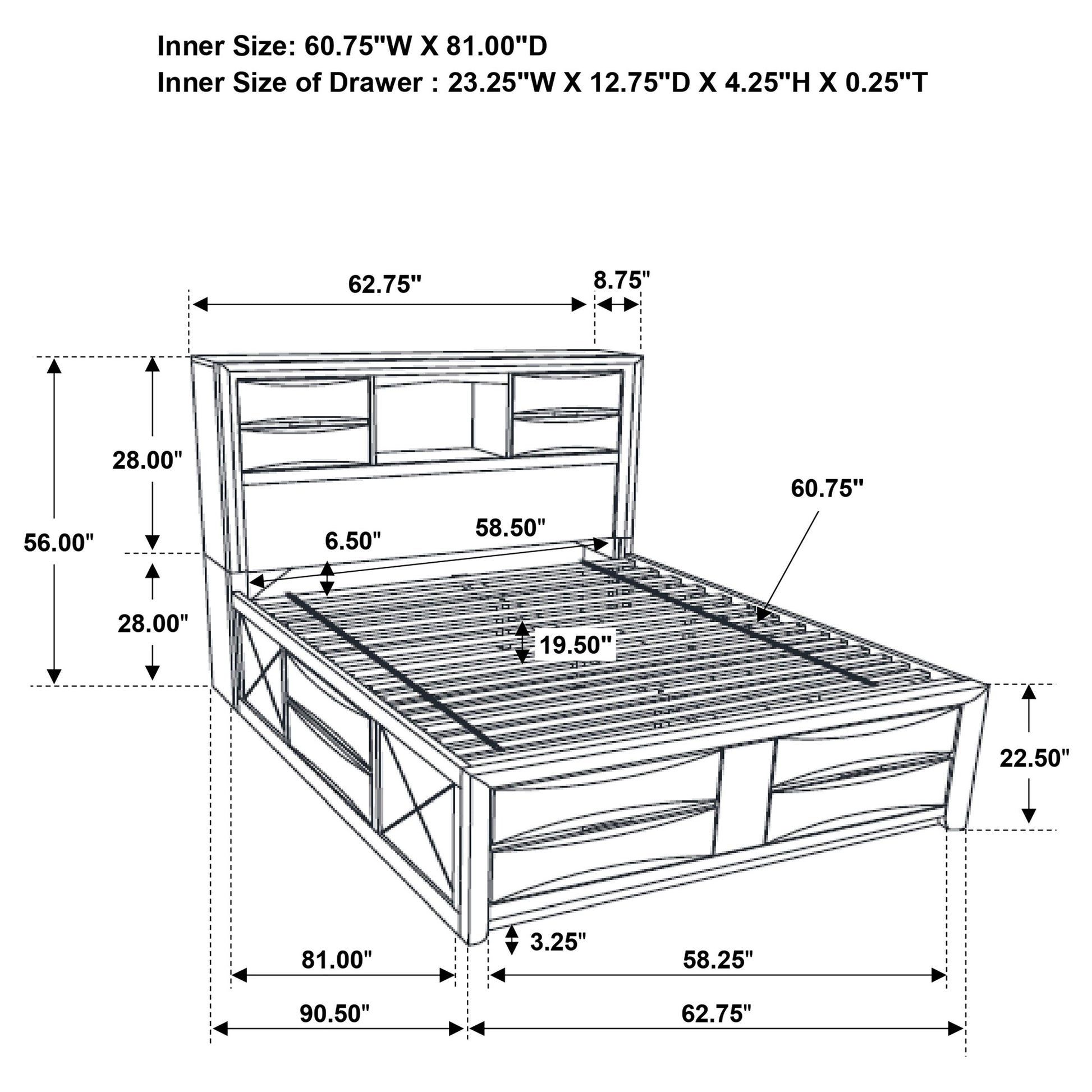 • Platform bed includes four footboard drawers for added storage