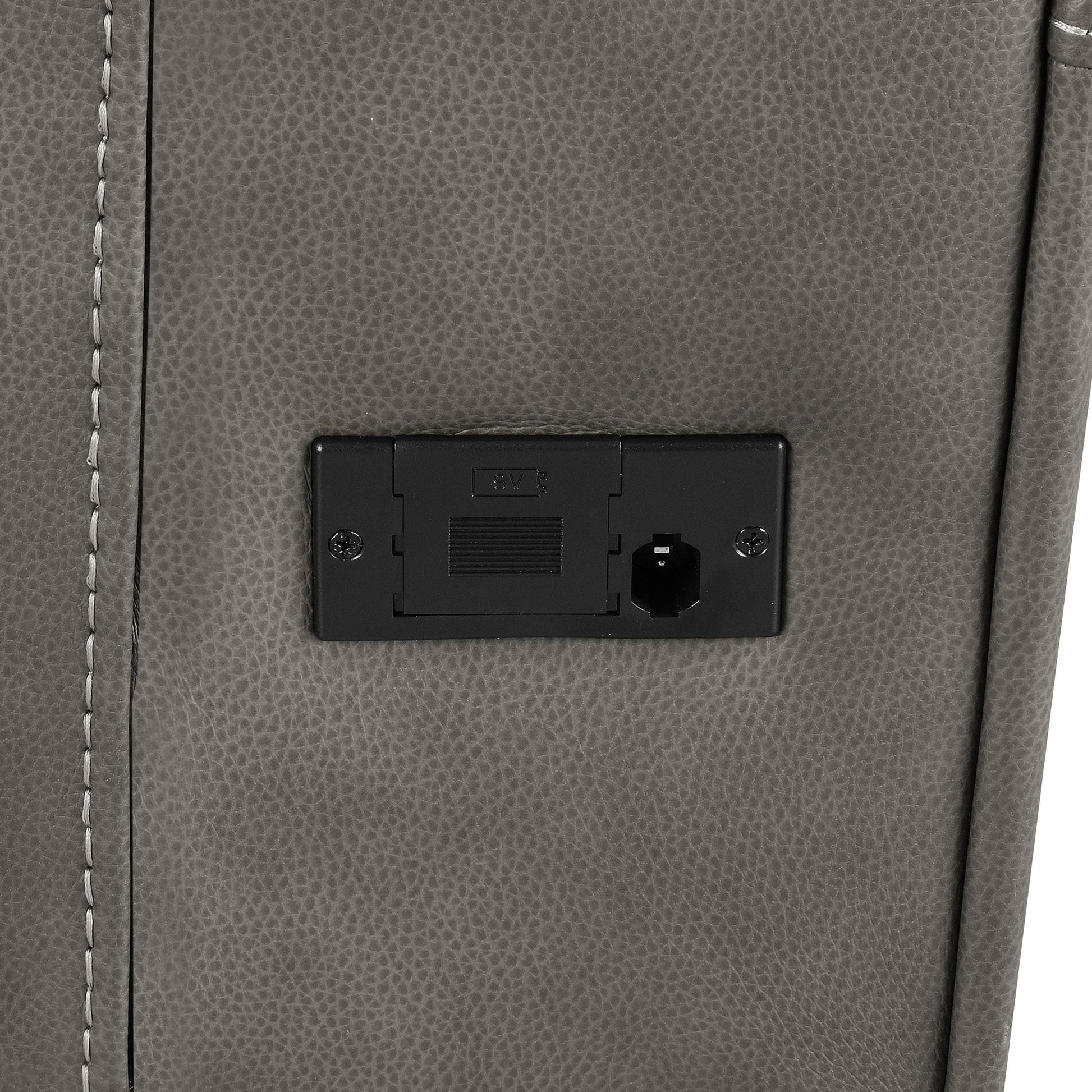 • Charcoal leatherette upholstery with contrast stitching offers soft texture and modern style