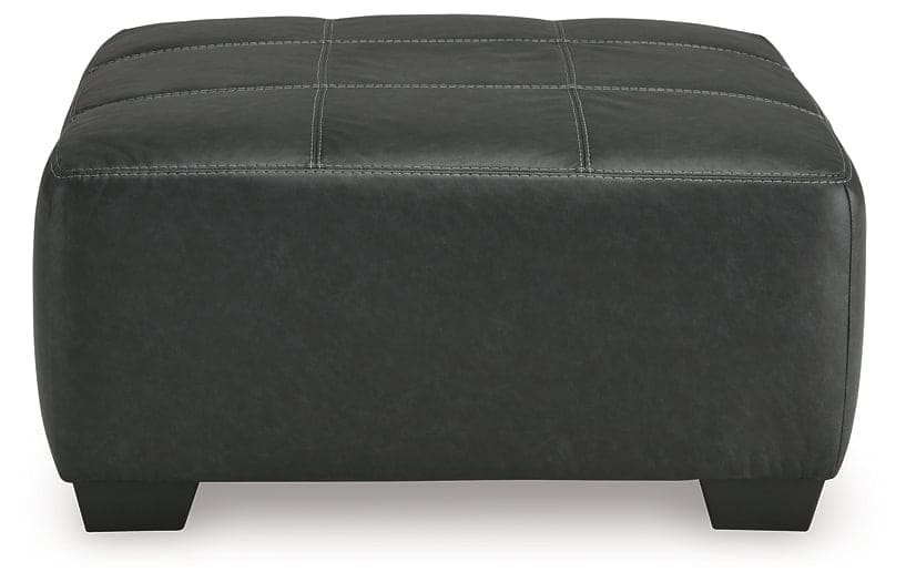 Appeal to your eye for ultra-contemporary design with this oversized accent ottoman. Chic and sleek in dark neutrals, it pairs cozy fabric with faux leather for invitingly cool character. And with its robust size offering extra legroom, you can chill out in comfort and style.