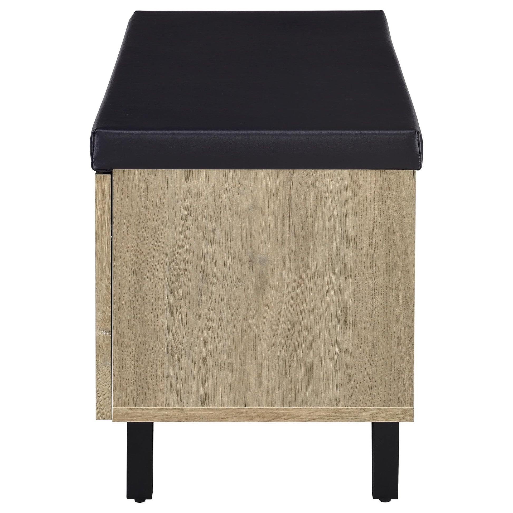 • Padded top upholstered in black faux leather serves as a convenient seating bench