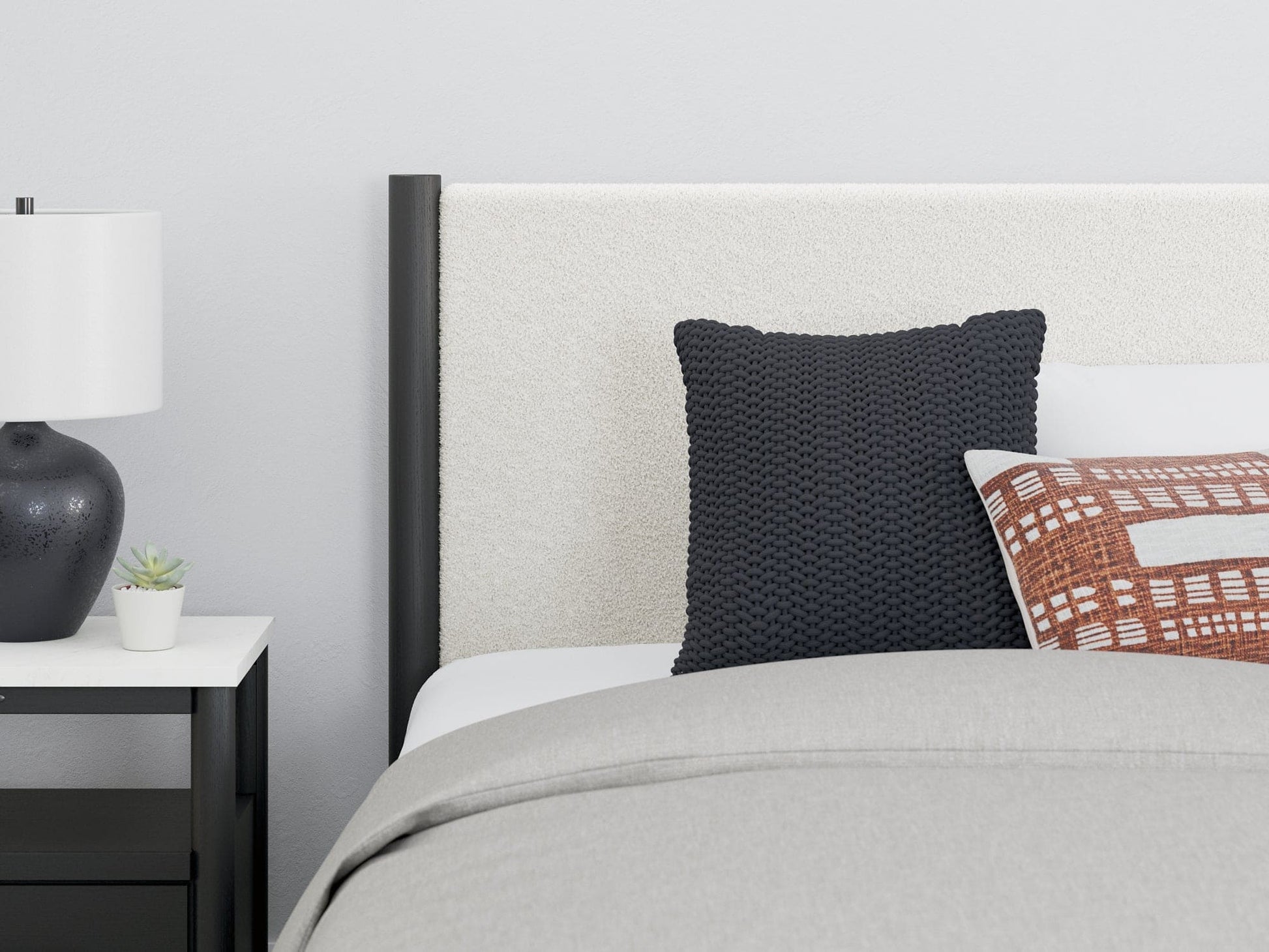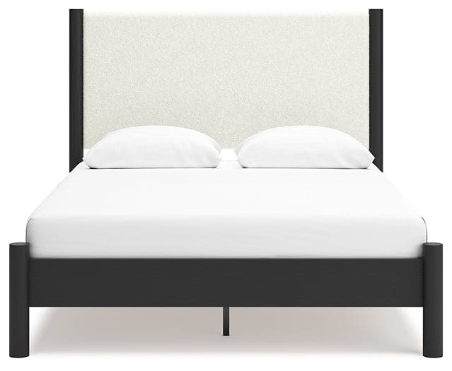 This queen upholstered panel bed reflects your sophisticated approach to boho style. Crafted with both form and function in mind, its fresh white fabric beautifully contrasts the matte black finish. The versatile design suits all-neutral spaces or blends with your favorite pops of color. It’s inviting, yet posh. Luxe, yet laid-back. With this bed, your free-spirited vibe meets modern design.