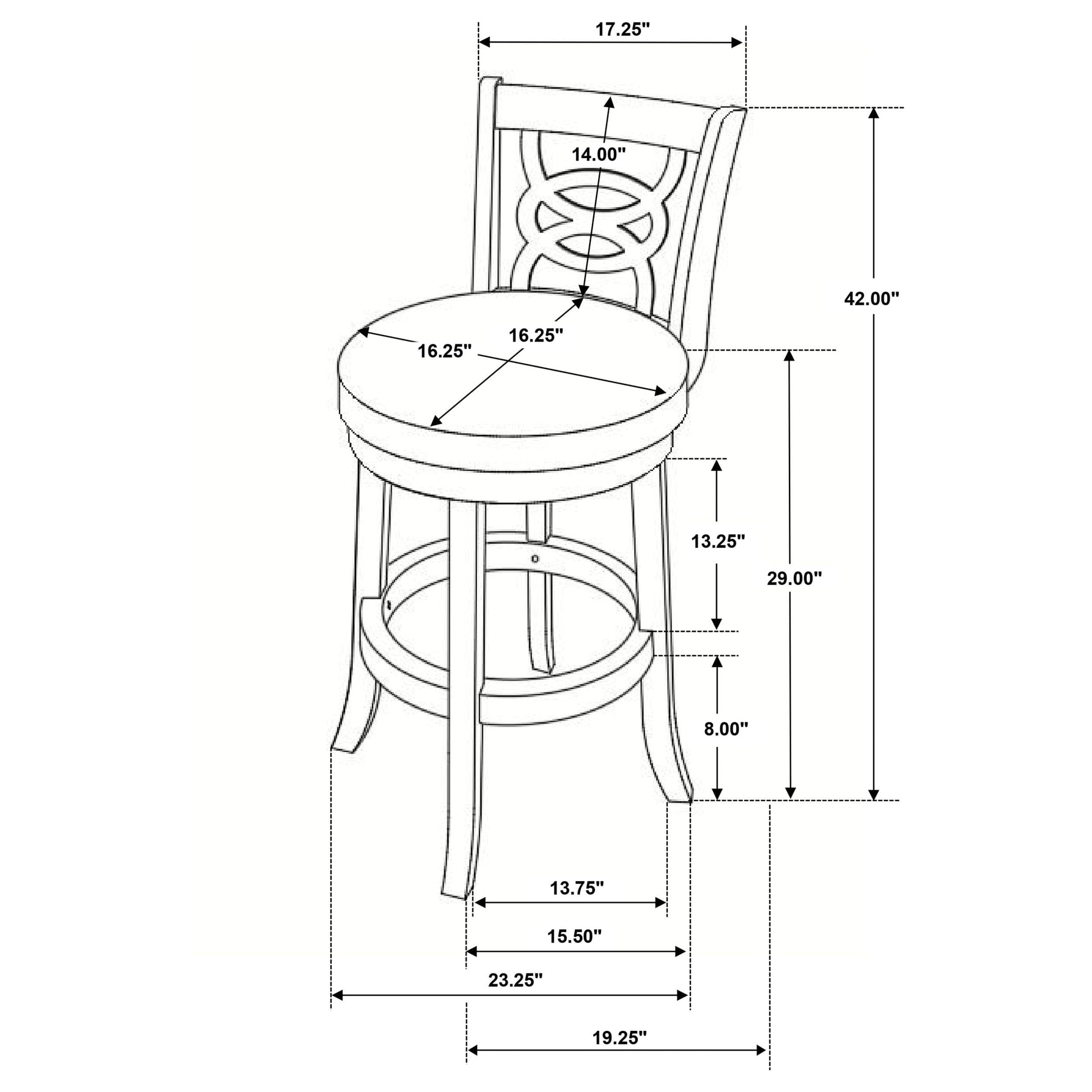 Bring timeless sophistication to your home bar with this swivel bar chair, featuring a cappuccino wood frame and padded black leatherette seat. Its unique open-back design creates an eye-catching focal point, while flared legs and a sturdy round footrest ensure stability. Designed with the comfort of a bar chair and the swivel function often associated with bar stools, this piece blends practicality with elegant design for any bar-height setting.