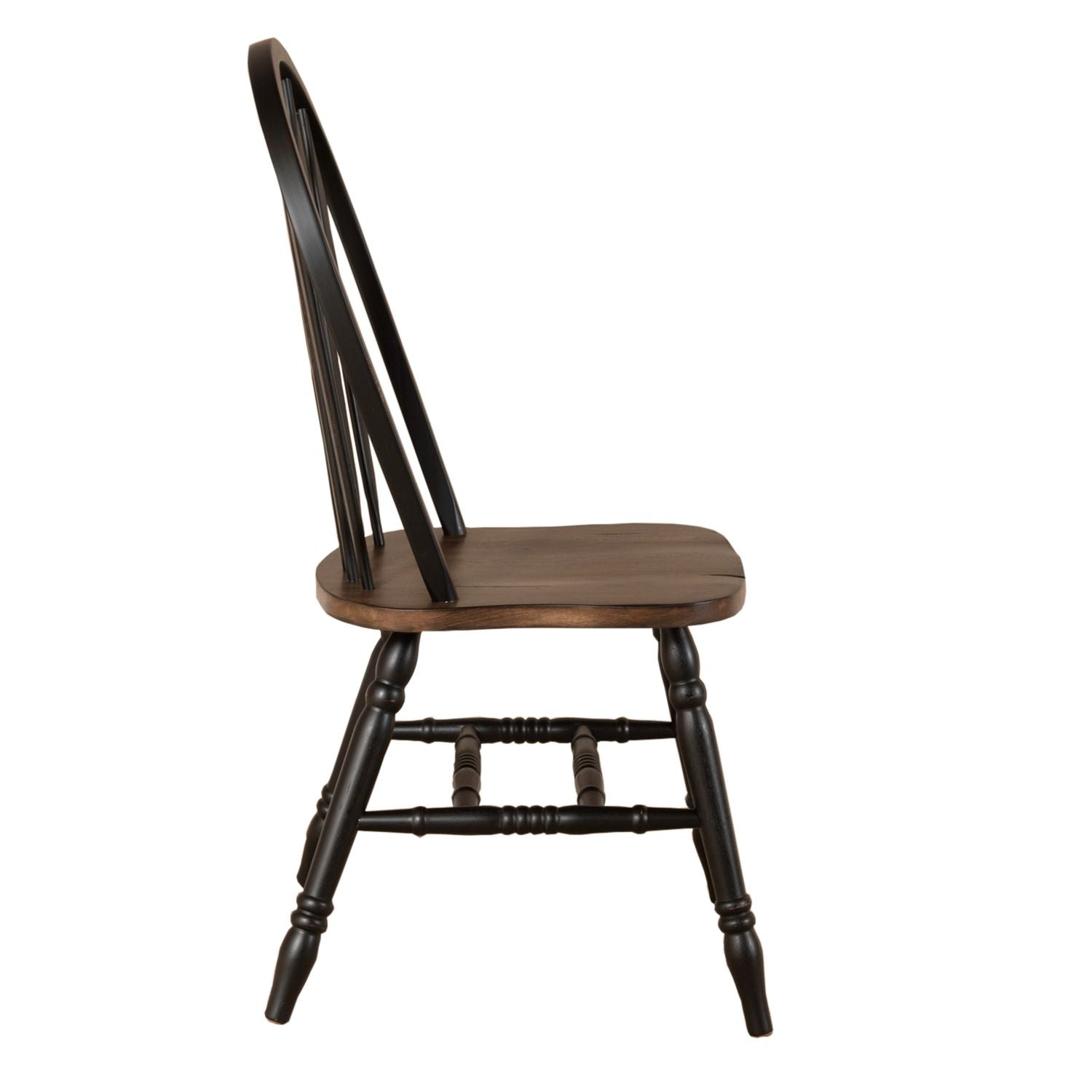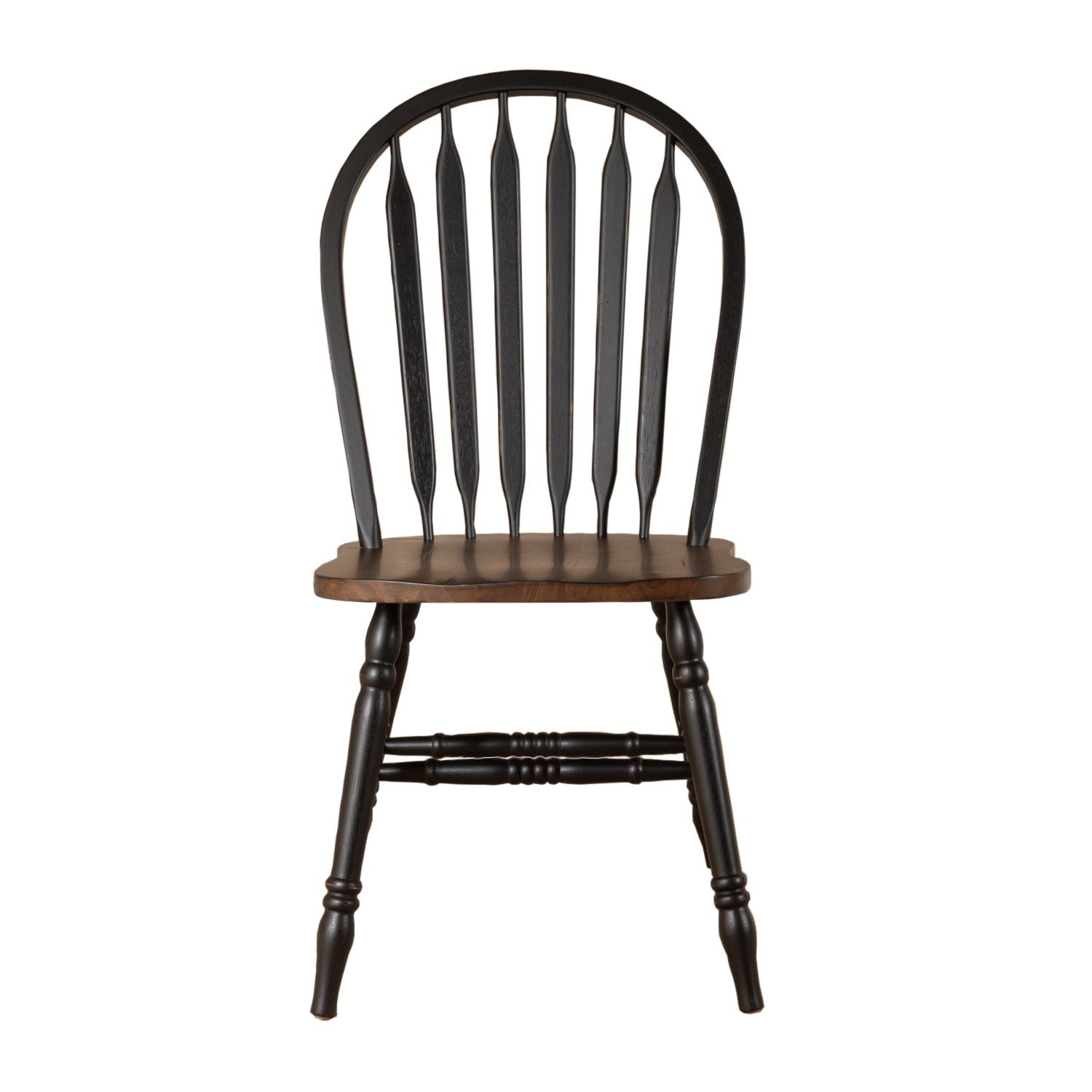 Sit in comfort and style with the Carolina Crossing Windsor side chair in black. Crafted of rubberwood solids, this piece features a two-toned black and honey finish, nylon chair glides to protect your flooring, and is anchored by turned splayed legs. This chair is available in multiple finishes and the heavy distressing translates well into any decor.