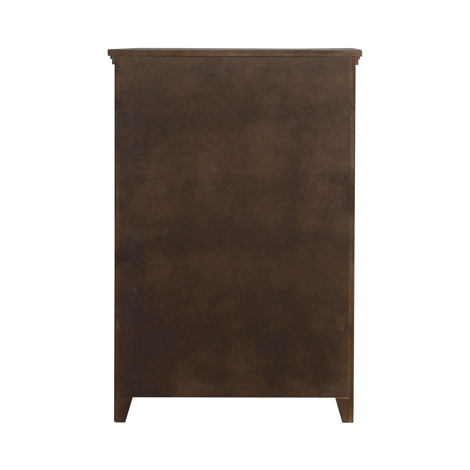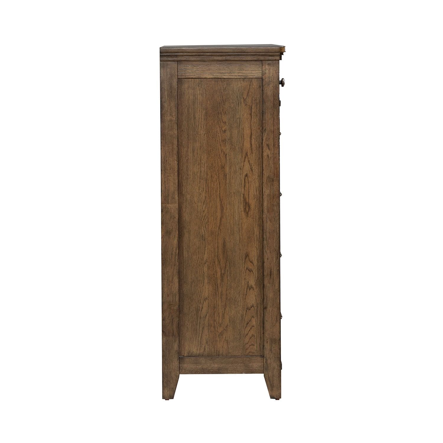 Create a calm and peaceful oasis with the Carolina Park 5 drawer chest. Crafted with excellence using Rubberwood solids and Split Heart White Oak veneers, this chest features an Amber Brown finish. Featuring a softly rounded top and wide pilasters flowing into angled tapered feet, this chest exudes sophistication, adding a touch of classic beauty to your bedroom decor. The top drawer of this chest boasts a flat-cut drawer front and premium felt lining, providing a luxurious storage solution for your most delicate items. Below it, four picture-framed drawers with softly shaped interior bead molding offer ample storage space while adding a subtle touch of refinement to the piece. For added functionality, the bottom drawer of the chest is cedar-lined, ideal for storing your seasonal clothing and linens while naturally repelling moths. Accentuating its aesthetic appeal, the drawers are adorned with Burnished Bronze bar pull and knob hardware, adding warmth and sophistication to the piece. Operating on soft-closing drawer guides, these drawers ensure smooth and quiet operation, enhancing your overall experience. Complete with framed end panels, the Carolina Park 5 drawer chest offers a cohesive and polished look that will elevate the ambiance of your bedroom with its timeless beauty and practical design.
