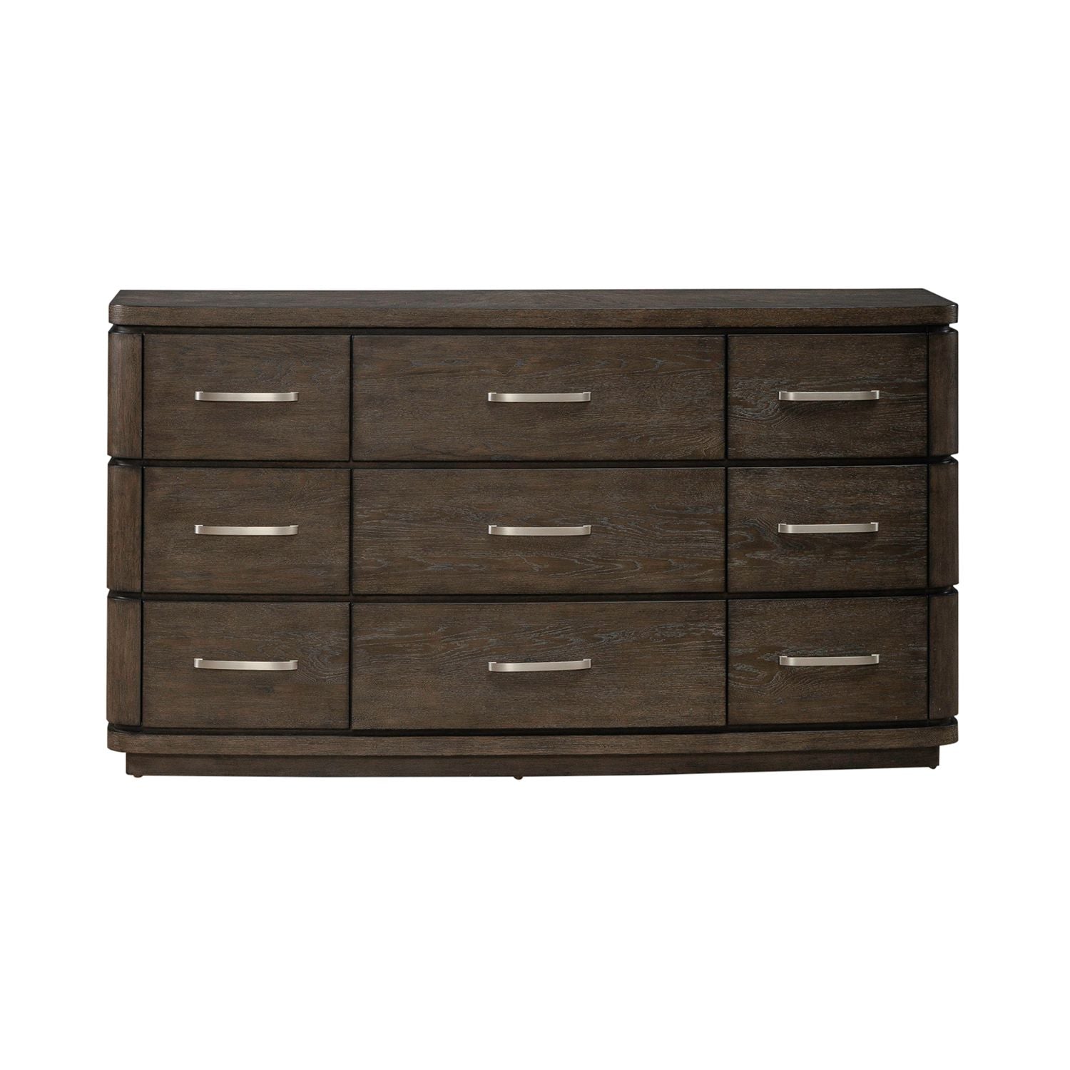 Elevate your bedroom décor to new heights of sophistication and comfort with the Cascade Falls 9 drawer dresser. Crafted with excellence using Rubberwood solids and Split Heart White Oak veneers, this dresser features a Satin Espresso finish. The bow shaping of the dresser adds a touch of soft contemporary flair, infusing the piece with graceful curves and understated charm. This subtle design element creates a sense of harmony and balance, enhancing the overall aesthetic of your bedroom space. Atop the dresser, a stunning starburst veneer pattern steals the spotlight, adding visual interest and sophistication. This intricate detail showcases the dresser's impeccable craftsmanship and attention to detail, making it a focal point of any room. Adding to its architectural appeal, reveal sections on the front and sides of the dresser offer glimpses of the finished frame, creating dimension and interest. These subtle accents elevate the dresser's design, making it a true work of art. Designed for both style and functionality, this dresser features soft-closing drawer guides for a gentle touch, ensuring smooth and quiet operation. The top drawers are lined with premium felt to protect delicate items, while the bottom drawers feature a cedar panel to keep your clothes fresh and fragrant. The drawers are accented with a custom Satin Nickel bar pull hardware. Softly rounded pilasters flow seamlessly into the inset bow-shaped plinth base, creating a cohesive and elegant look. The Cascade Falls 9 drawer dresser is a testament to refined craftsmanship and impeccable design, making it the perfect addition to any bedroom decor.