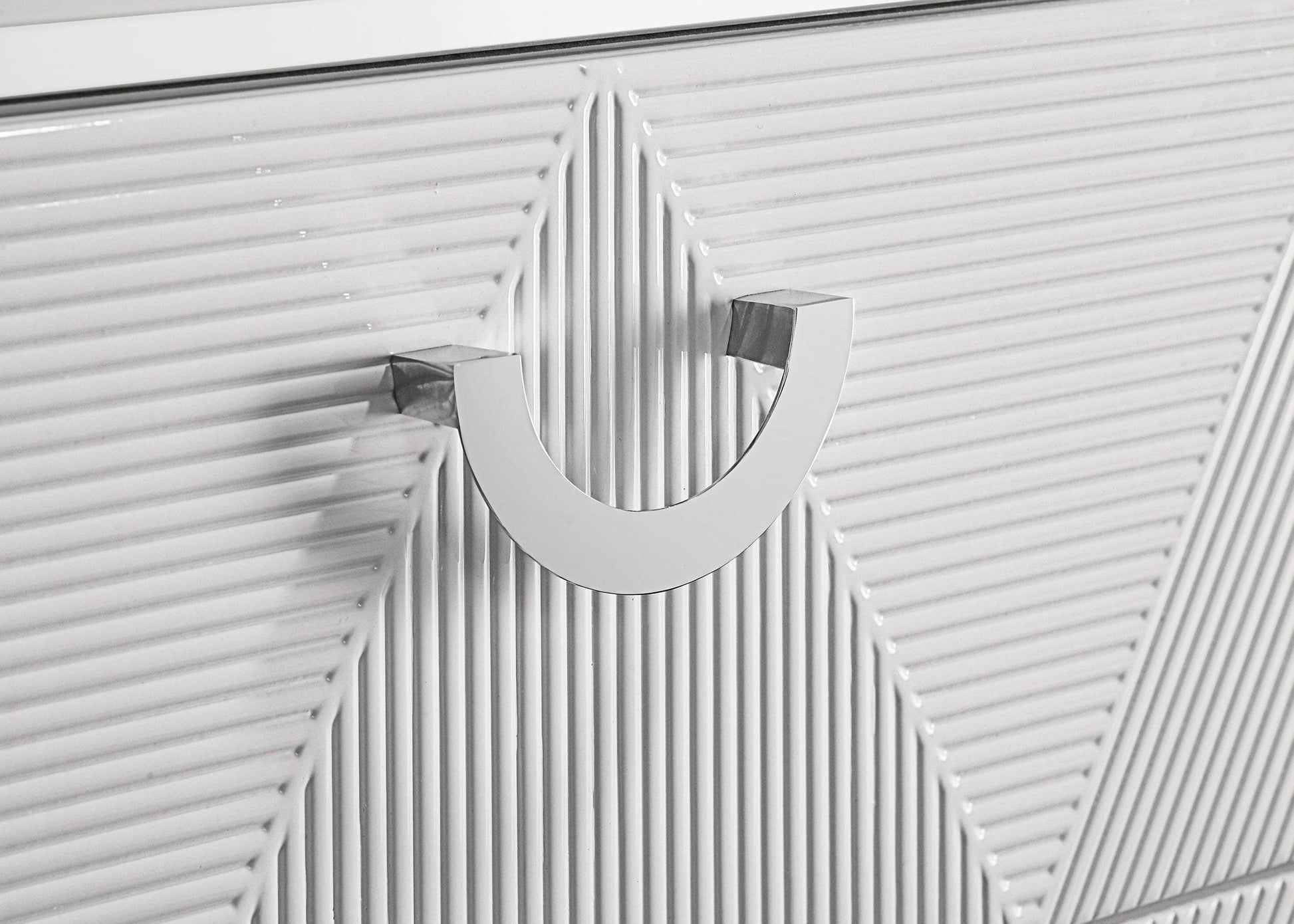 Crisp white high gloss and sculptural textures define this modern bedroom set, blending sleek surfaces with dimensional details. Geometric drawer fronts feature ribbed V-patterns and polished chrome pulls, while all drawers glide smoothly on 45mm metal extension hardware. The headboard stands out with chevron-tufted white faux leather framed by soft white LED trim. Completing the ensemble, a coordinating LED dresser mirror adds ambient glow and polished symmetry to the space. Elevated on chrome legs, this set is a showcase of contemporary form and function.