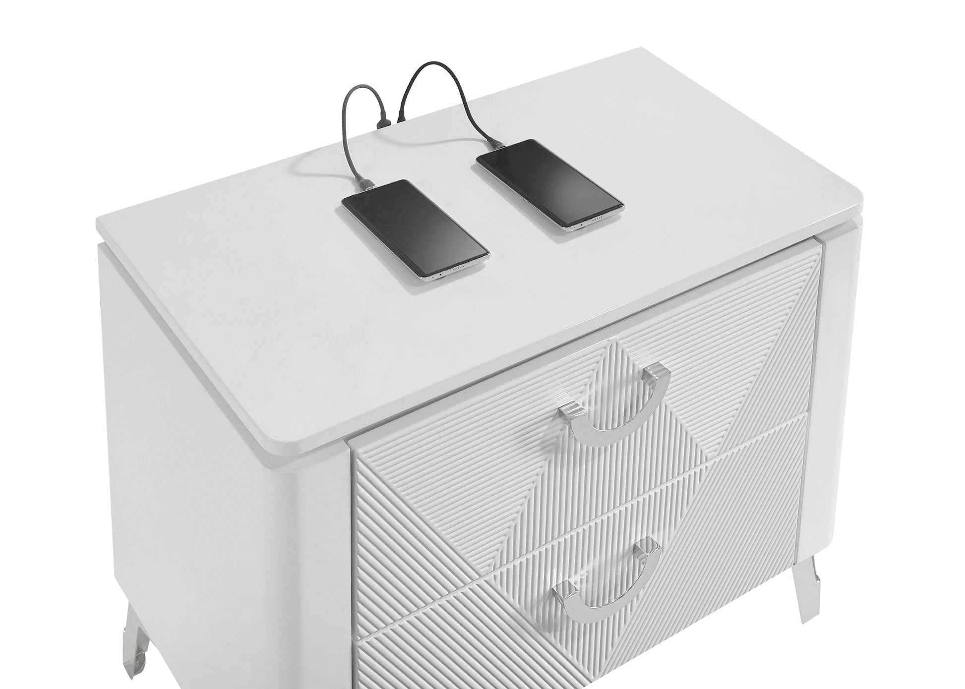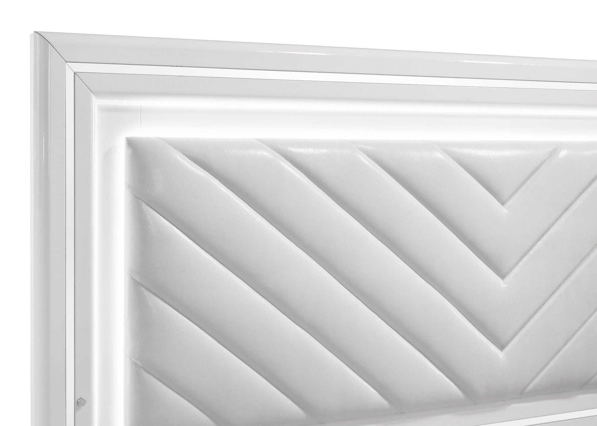 Crisp white high gloss and sculptural textures define this modern bedroom set, blending sleek surfaces with dimensional details. Geometric drawer fronts feature ribbed V-patterns and polished chrome pulls, while all drawers glide smoothly on 45mm metal extension hardware. The headboard stands out with chevron-tufted white faux leather framed by soft white LED trim. Completing the ensemble, a coordinating LED dresser mirror adds ambient glow and polished symmetry to the space. Elevated on chrome legs, this set is a showcase of contemporary form and function.