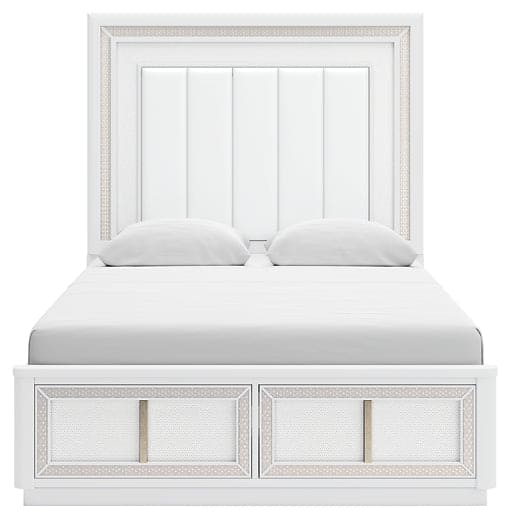 | Details | Includes queen upholstered headboard, storage footboard, rails and roll slats, Made with solid wood components, MDF substrate and decorative laminate, White lacquer finish, Vertical metal drawer pulls, Faux leather upholstery, Built-in LED lighting with 3-way dimmer switch, 2 drawers with fully finished interior, dovetail construction and ball-bearing side glides, Drawers with rhinestone frames; textured laminate drawer fronts, Power cord included; UL Listed, Bed does not require additional foundation/box spring; accommodates most zero clearance adjustable bases with the addition of a bunkie board, Mattress available, sold separately, Assembly required | |