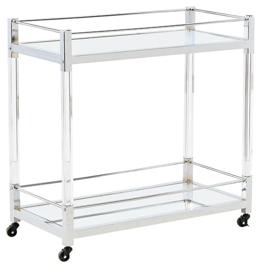 Reflect your love for contemporary style with this bar cart. With two shelves made with mirrored glass, it adds both light and a touch of glam to your space. A clear acrylic and chrome-tone frame is a modern take on understated elegance. And thanks to rolling casters, serving your guests has never been easier.