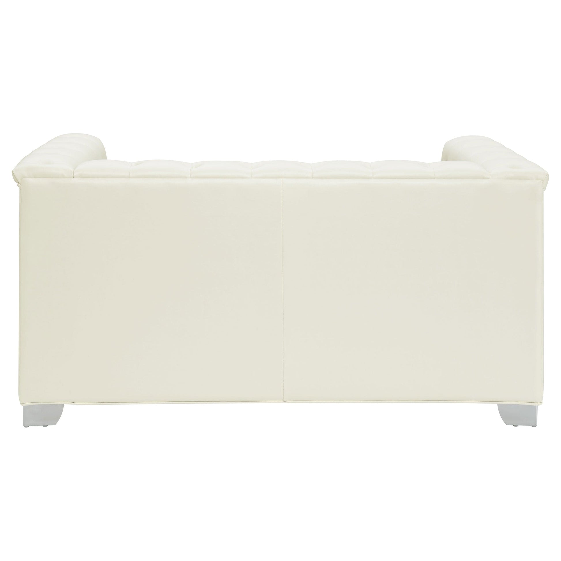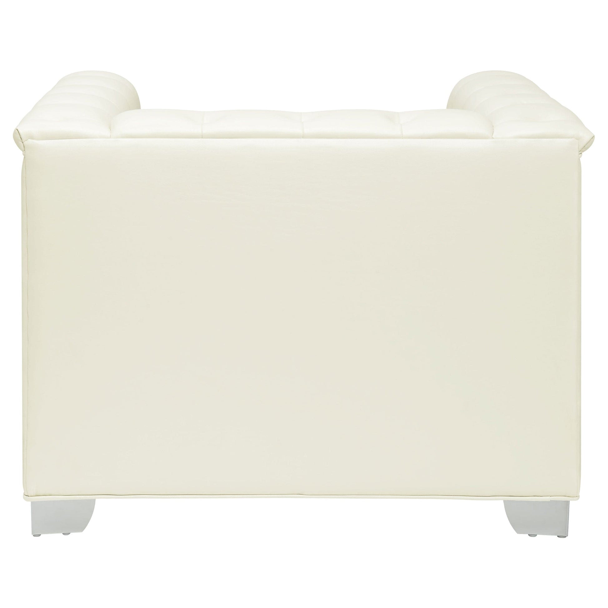 Sleek lines and chic details elevate this glamourous three piece living room set. With a contemporary styling low profile, the silhouette of the sofa, loveseat, and chair are modern. Deep button tufting and quilted detailing are given a crisp feel with white padded, breathable leatherette upholstery. Stylishly bright, the chrome heavy duty doorknocker handles and legs create visual intrigue. Dress up a space with the light hues and radiant metallic details.